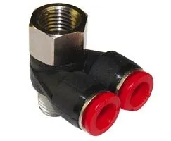 Yes. The fitting is a Banjo-shaped Pneufit C with an 8 mm O/D tube and R1/4 thread/port, designed for compact manifold layouts and easy integration into existing pneumatic circuits without adapters or rework.