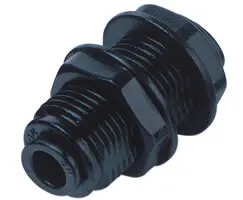 The Pneufit D is a bulkhead-style push-in connector with 4 mm tubing and M15 x 1.5 threading for straight panel-mounted applications, enabling rapid field assembly and straightforward phase-out or reconfiguration alongside Pneufit C or M lines.