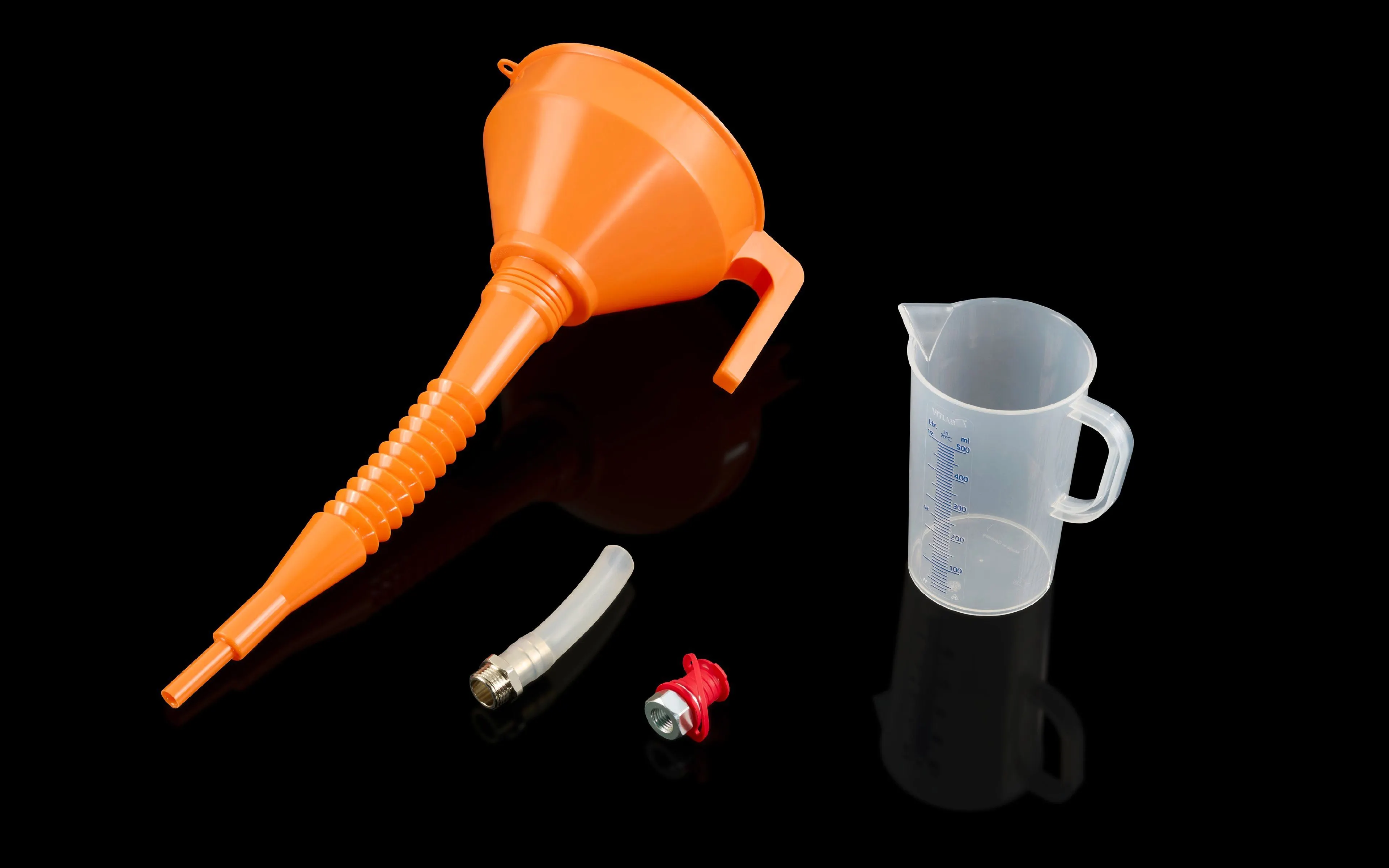 Oil change kit for CW120 including a funnel, 0.5 l measuring jug, hydraulic vent plug and funnel adaptor for screwing onto the pump