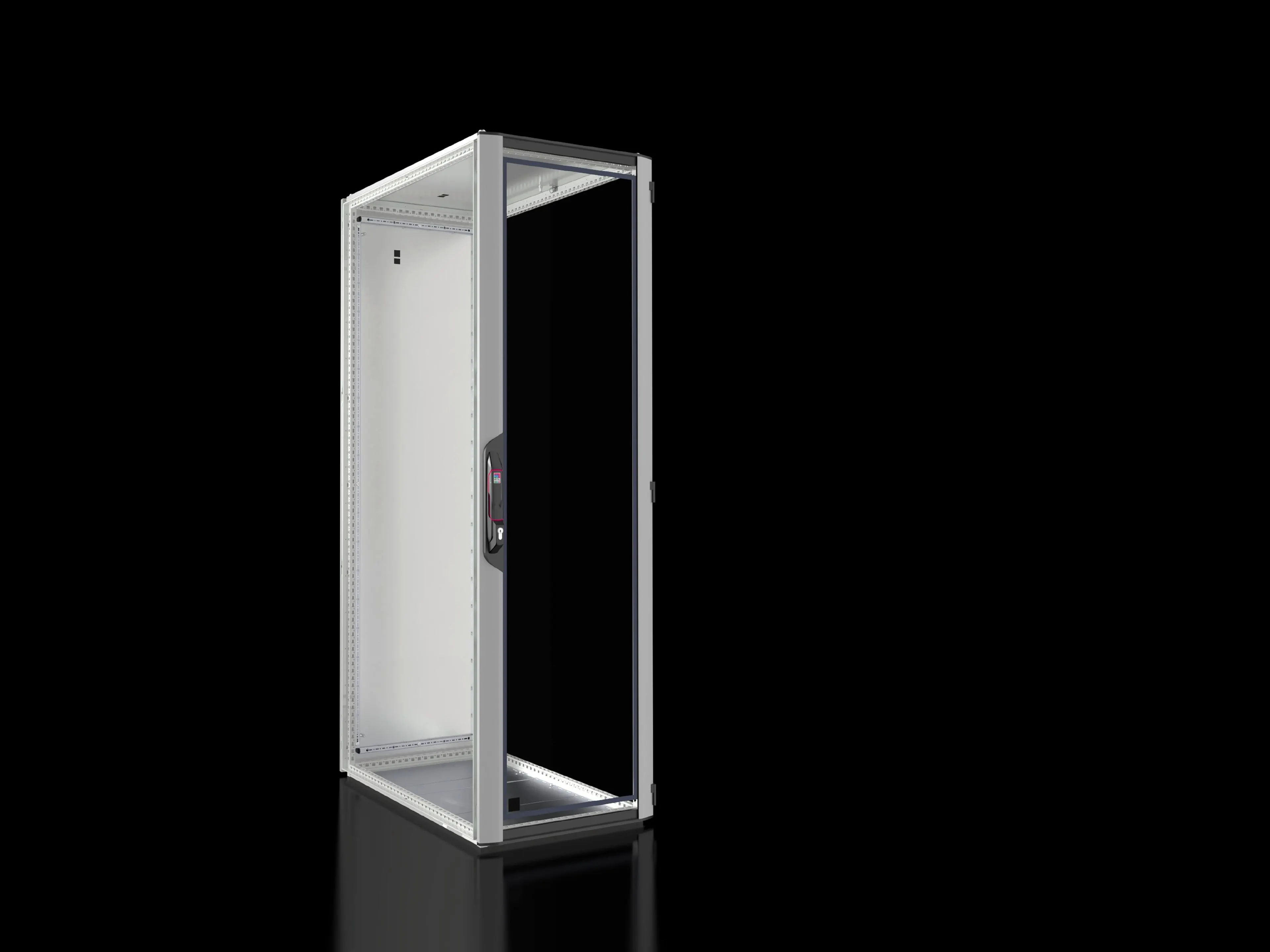 Rittal VX IT enclosure provides rugged climate-controlled housing for electrical and automation assemblies in industrial settings. It protects sensitive equipment from dust, moisture, and temperature swings while delivering easy access for maintenance. In tight production areas, mounting inside a standard 482.6 mm (19 in) interior isn't always feasible; VX IT can be ordered without this interior installation to let you configure your own rack layout. The front is a glazed aluminium door with visibility into the cabinet, while the rear is a solid sheet steel door with robust hinges, supporting flexible access. With IP55 protection and IK08 impact resistance, this cabinet supports reliable operation in harsh environments. The 42U capacity and carefully chosen materials make it a scalable, cost-efficient solution for IT and automation projects.