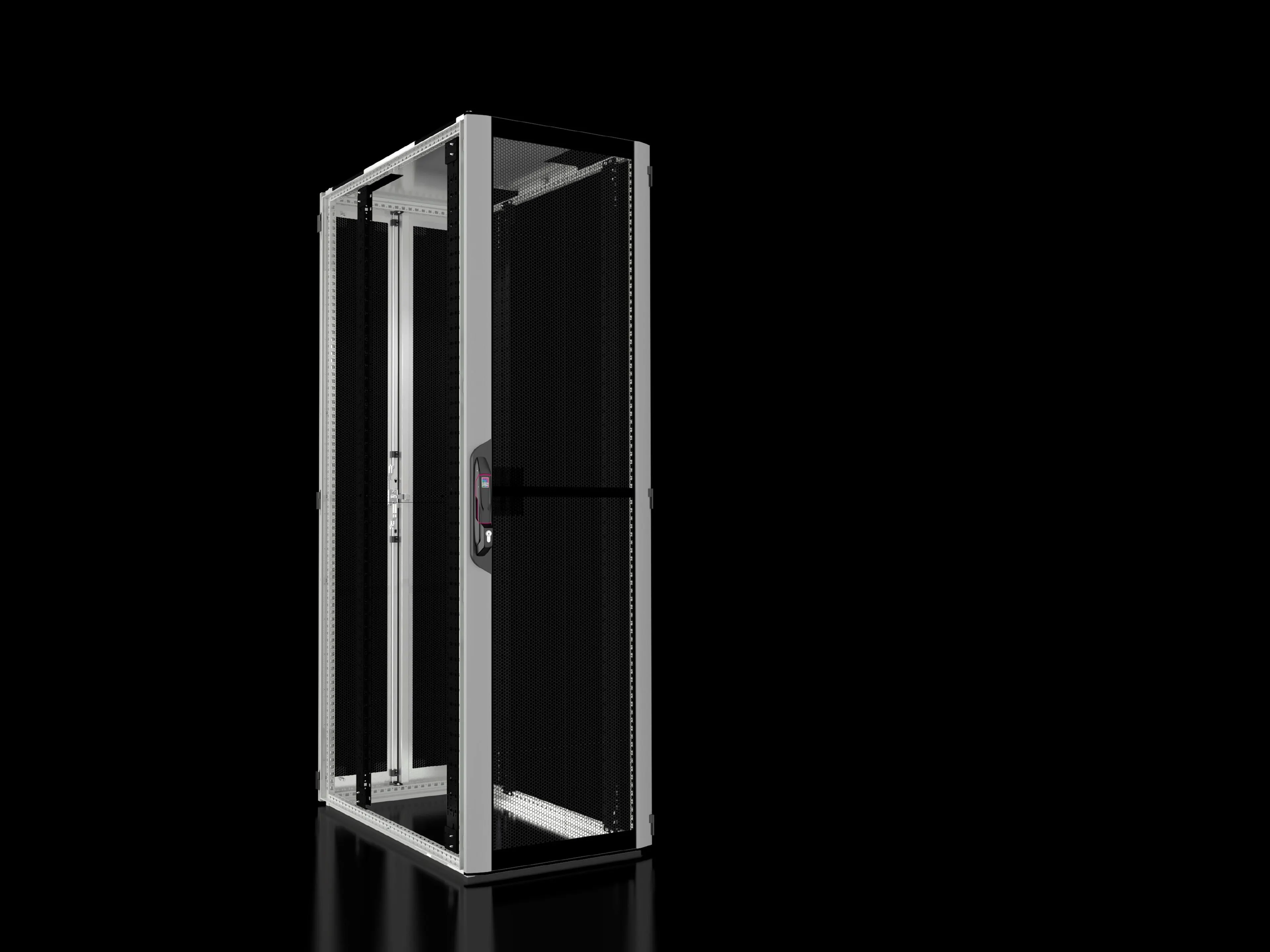 VX enclosure frame with doors and roof plate | Aluminium/sheet steel door at the front, vented (vented surface area approx. 85% perforated), 180° hinges | Sheet steel rear door, vented (vented surface area approx. 85% perforated) | Lock front and rear: Comfort handle for profile half-cylinders and security lock 3524 E | Mounting angles, 482.6 mm (19") | Spacers, height 50 mm, to raise a cover plate above the fan cut-out in the roof plate, for passive cooling (supplied loose). Not required for variants without a cut-out. | 12 x 482.6 mm (19") fastener, 1 U, conductive (supplied loose) | 25 multi-tooth screws, conductive (supplied loose) | IPPC pallet | Roof plate, multi-piece, with cable entry in the corner sections front and rear | Sheet steel rear door, vented, vertically divided, 180° hinges