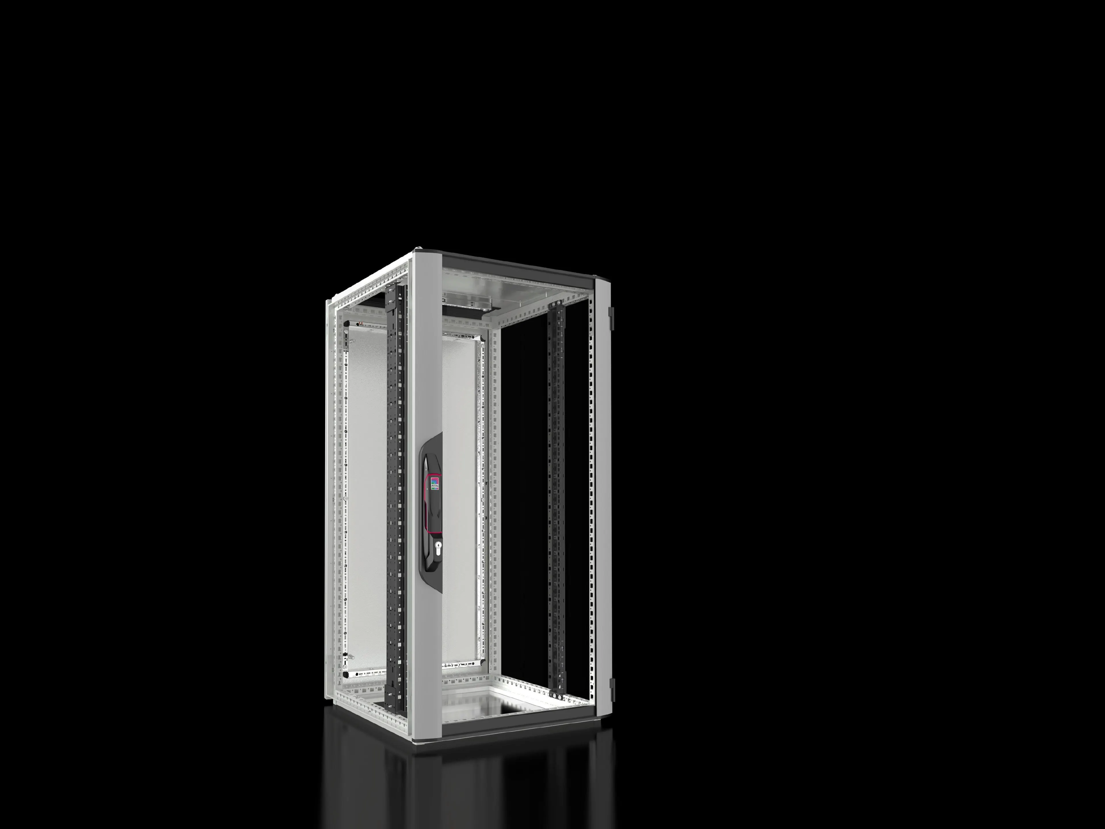 VX enclosure frame with doors and roof plate | Glazed aluminium door at the front, 180° hinges | Lock front and rear: Comfort handle for profile half-cylinders and security lock 3524 E | Mounting angles, 482.6 mm (19") | Spacers, height 50 mm, to raise a cover plate above the fan cut-out in the roof plate, for passive cooling (supplied loose). Not required for variants without a cut-out. | 12 x 482.6 mm (19") fastener, 1 U, conductive (supplied loose) | 25 multi-tooth screws, conductive (supplied loose) | IPPC pallet | Roof plate, multi-piece, with horizontal cable entry at the rear and prepared for fan mounting plate | Sheet steel rear door, solid, one-piece, 130° hinges