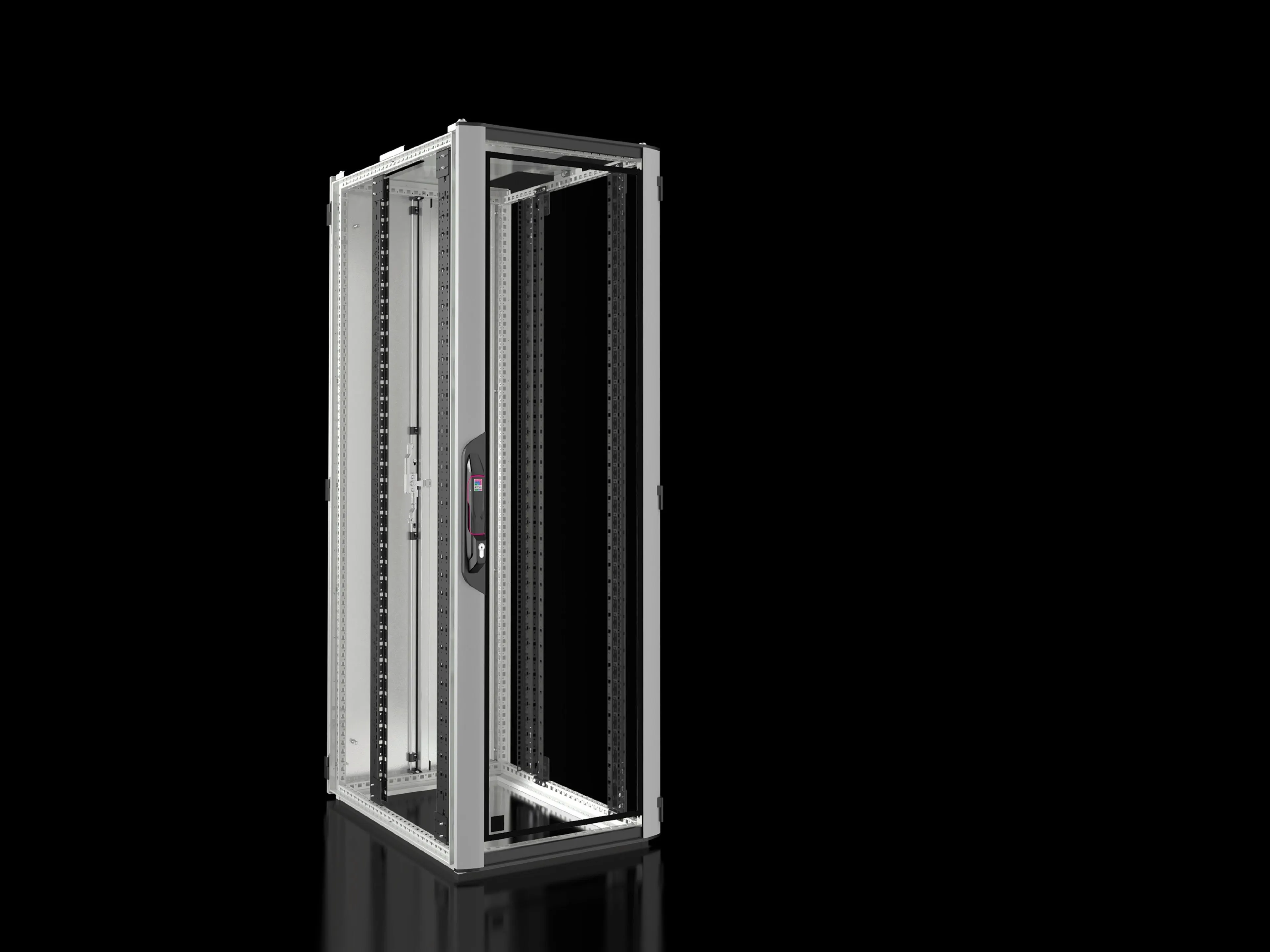 VX enclosure frame with doors and roof plate | Glazed aluminium door at the front, 180° hinges | Lock front and rear: Comfort handle for profile half-cylinders and security lock 3524 E | Mounting angles, 482.6 mm (19") | Spacers, height 50 mm, to raise a cover plate above the fan cut-out in the roof plate, for passive cooling (supplied loose). Not required for variants without a cut-out. | 12 x 482.6 mm (19") fastener, 1 U, conductive (supplied loose) | 25 multi-tooth screws, conductive (supplied loose) | IPPC pallet | Roof plate, multi-piece, with cable entry in the corner sections front and rear | Sheet steel rear door, solid, vertically divided, 180° hinges