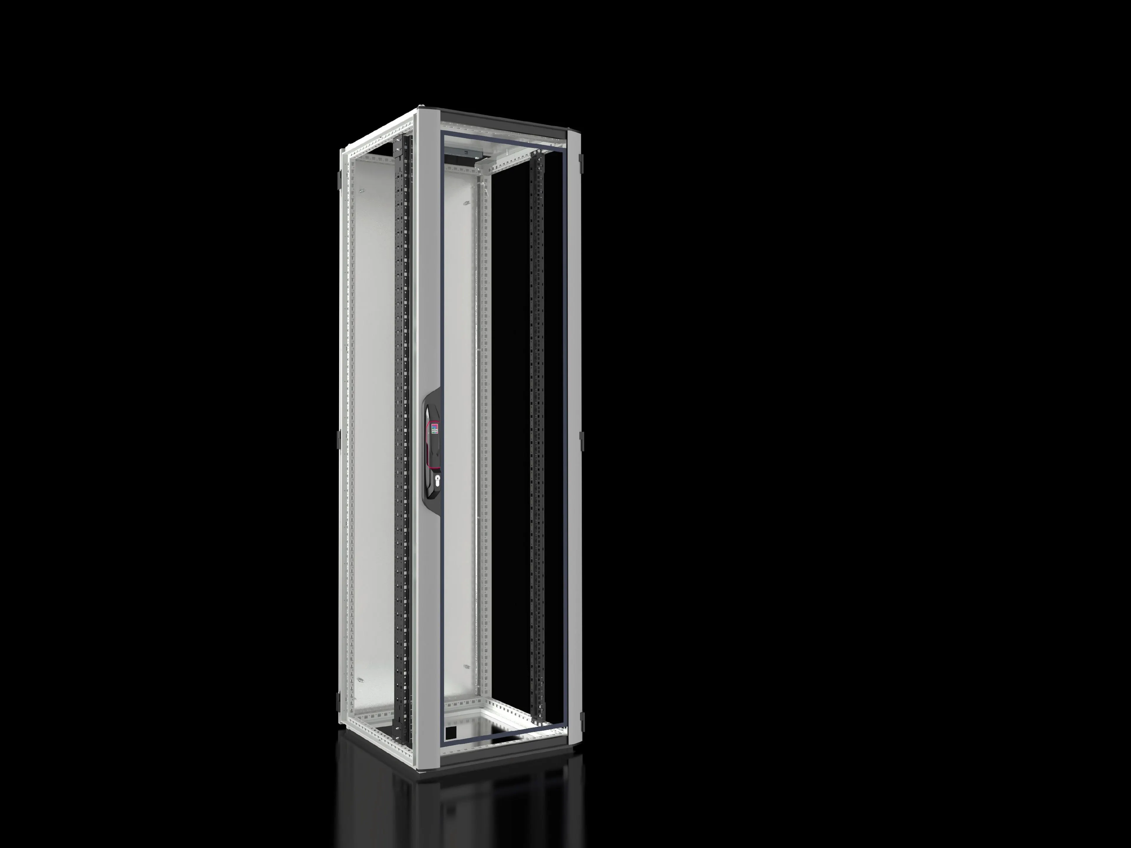 VX enclosure frame with doors and roof plate | Glazed aluminium door at the front, 180° hinges | Lock front and rear: Comfort handle for profile half-cylinders and security lock 3524 E | Mounting angles, 482.6 mm (19") | Spacers, height 50 mm, to raise a cover plate above the fan cut-out in the roof plate, for passive cooling (supplied loose). Not required for variants without a cut-out. | 12 x 482.6 mm (19") fastener, 1 U, conductive (supplied loose) | 25 multi-tooth screws, conductive (supplied loose) | IPPC pallet | Roof plate, multi-piece, with horizontal cable entry at the rear and prepared for fan mounting plate | Sheet steel rear door, solid, vertically divided, 180° hinges
