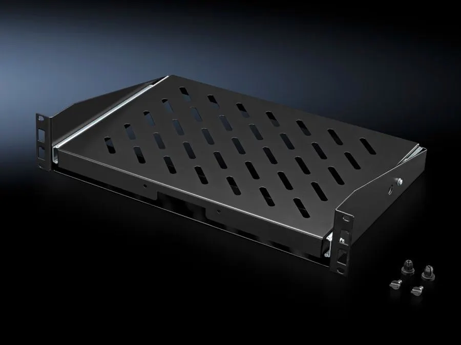 The shelf arrives with telescopic slides, moulded handle, flange and locking pins pre-installed, enabling tool-free assembly and front-access installation. This minimizes field labor, reduces the risk of missing components, and accelerates commissioning in production environments.