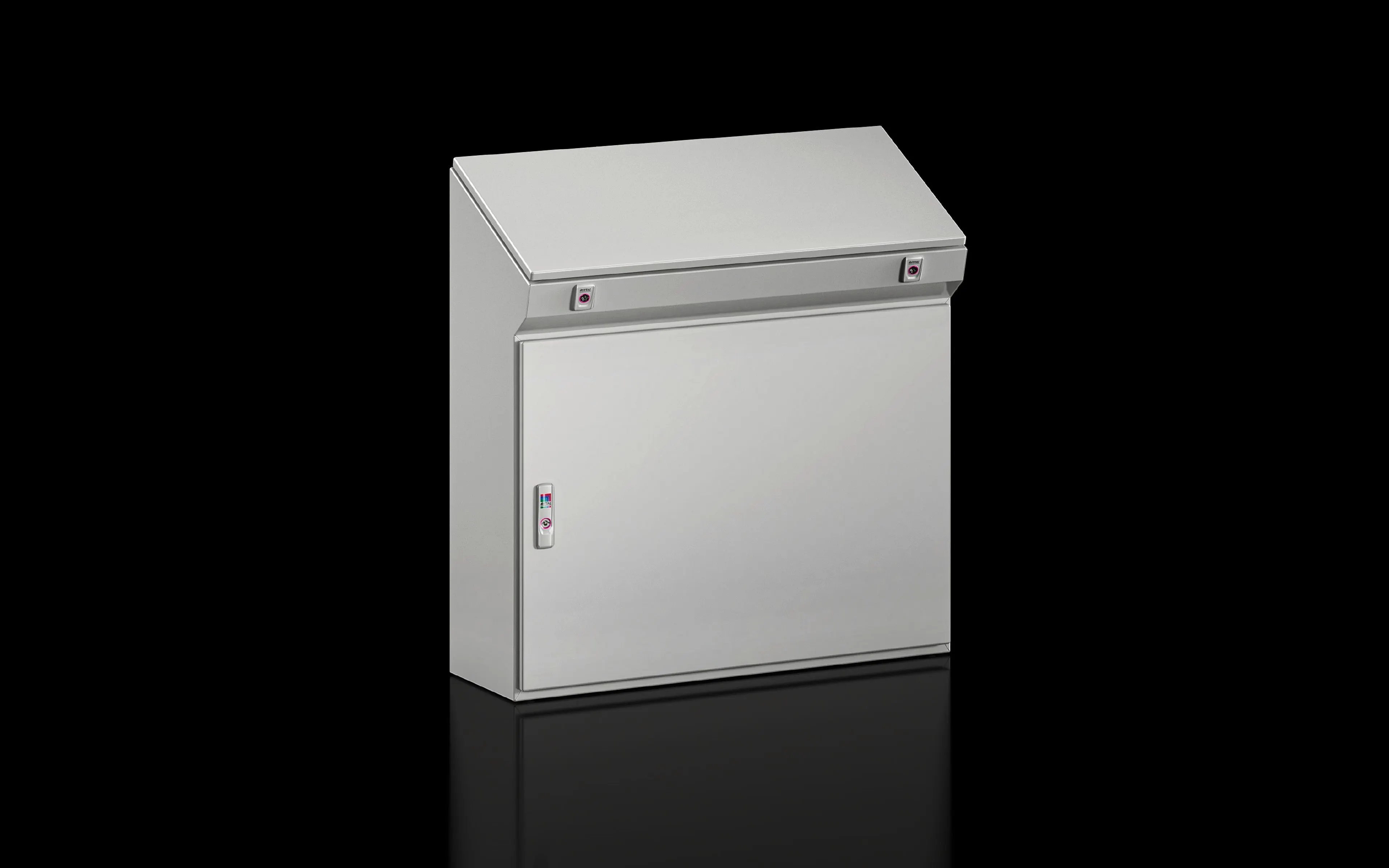 Enclosure, solid back and sides | Door or double-door at front, with 3-point locking system | Mounting plate | Cover with cam locks, hinged at the rear, 2 stays with automatic latching. Automatic unlatching on the left, manual on the right. | Gland plate | Lock: 3 mm double-bit