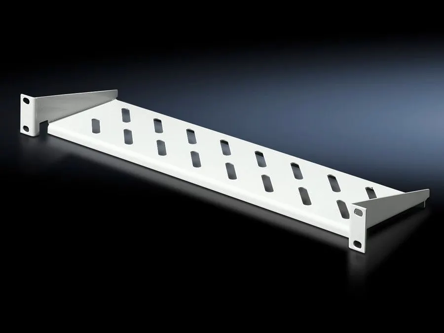 Feature: 482.6 mm width and 1U height design for 19" system punchings → Business impact: aligns with standard enclosure infrastructure, reducing custom fabrication and installation time → Application: ideal for mounting small active components like modems or mini-hubs inside Rittal cabinetry. Feature: Load capacity of 10 kg surface load (static) → Business impact: supports reliable operation of lightweight network and control devices without risk of sag or vibration → Application: suitable for 482.6 mm (19") rack configurations in control cabinets. Feature: Material is sheet steel with a RAL 7035 finish → Business impact: durable, corrosion-resistant surface that remains visually consistent in industrial environments → Application: easy to clean and maintain within harsh manufacturing surroundings. Feature: Static installation with no telescopic slides → Business impact: provides a rigid, vibration-resistant mounting platform that reduces maintenance and misalignment → Application: preferred where fixed mounting is required. Feature: PCF 3.2 kg CO2 eq (Cat B) for cradle-to-gate emissions → Business impact: supports sustainable procurement decisions and lifecycle thinking → Application: aligns with green manufacturing initiatives. Feature: Not suitable for combination with telescopic slides → Business impact: prevents improper configurations that could compromise load performance → Application: ensures correct use within standard punchings and fixed-surface layouts.