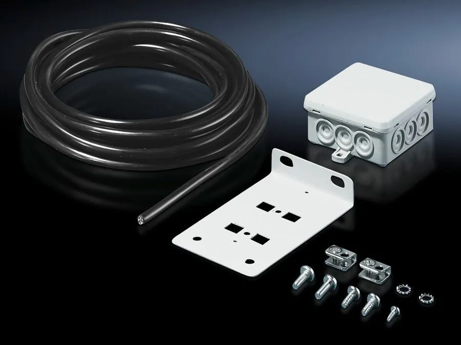 Feature: The DK 7280.035 kit includes 1 bracket, 1 junction box, and a 6 m 3x1.5 mm² flexible connection cable. Business Impact: Reduces field wiring time and points of failure, speeding installation and improving reliability. Application: Suitable for TS 8 frame enclosures powering fans, system lights and socket strips in industrial panels. Feature: Sheet steel construction with a durable RAL 7035 finish. Business Impact: Provides rugged protection against impact and corrosion in manufacturing environments, extending service intervals and lowering maintenance costs. Application: Fits in maintenance-intensive control cabinets and data centers requiring long service life and predictable uptime. Feature: Integral holes allow optional thermostat SK 3110.000 or hygrostat SK 3118.000 mounting without extra brackets. Business Impact: Simplifies upgrade paths and reduces hardware overhead, saving installation time during climate control optimization. Application: Enables quick climate management in electrical enclosures without redesigning the enclosure interior. Feature: The package lists 1 bracket, 1 junction box, and 6 m cable; weight per pack is 0.887 kg; PCF per pack is 3.4 kg CO2 eq (Cat B). Business Impact: Provides predictable BOM for procurement, supporting lean inventory. Application: Orderable as a single, complete kit. Feature: ECLASS 27144401 and ETIM EC002600 classifications provide interoperability and data quality for ERP and PLM integration. Business Impact: Improves catalog accuracy and reduces mismatch risk in sourcing, while EAN and GTIN identification ease stock control and field service. Application: Supports data-driven procurement in automation projects.