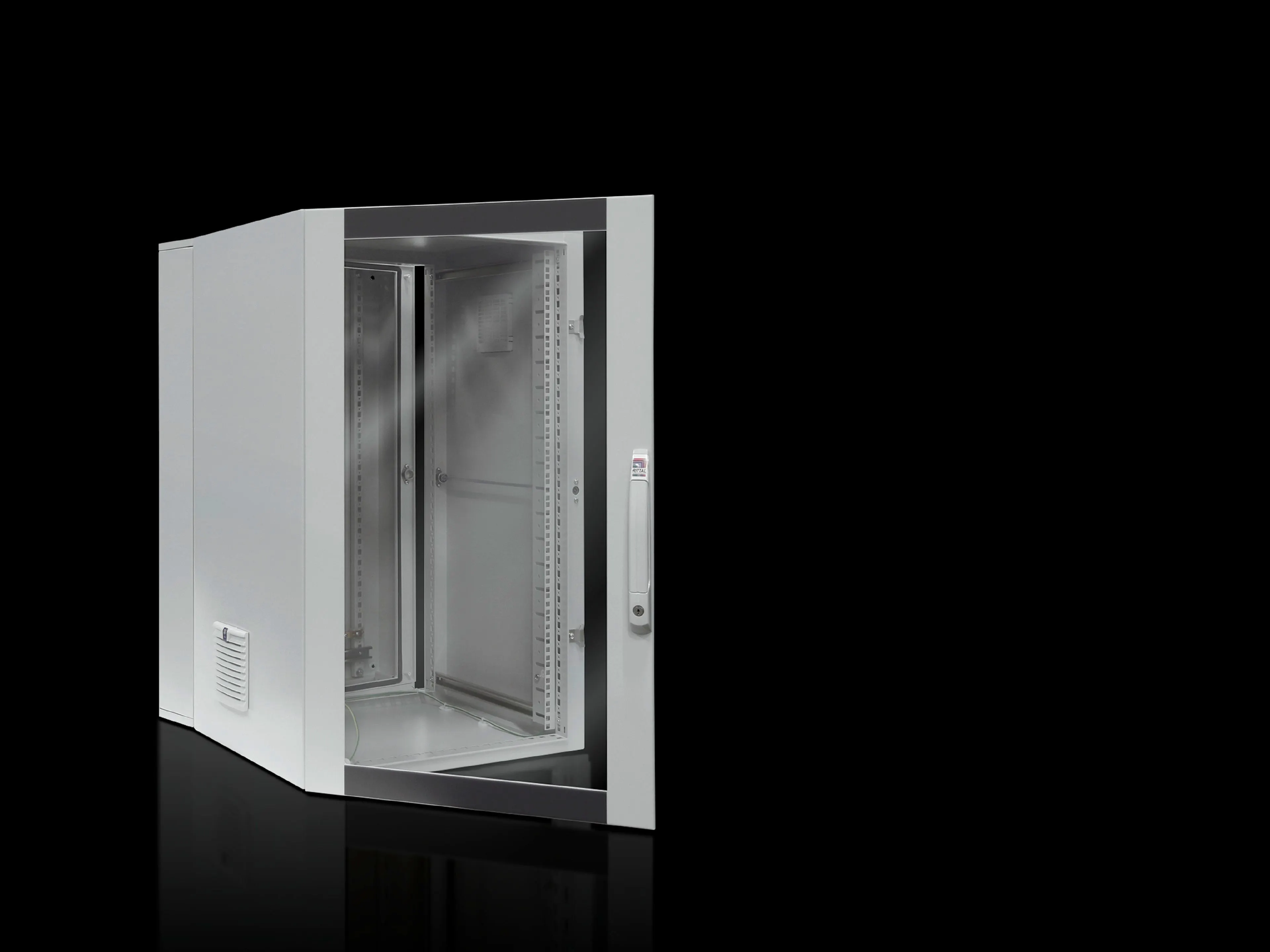 Wall section with solid gland plate at the top and brush strip at the bottom, two vertical mounting rails and C rail, horizontal, for cable clamping | Hinged part with 25 mm pitch pattern of holes in the front and rear frame, two 482.6 mm (19") mounting angles at the front, infinitely depth-variable, and side outlet filters on the left and right | Earth rail with star earthing | Designer glazed door | 1 double-kit key no. 5 | Wall mounting bracket, 10 mm | Comfort handle for lock inserts and 2-point locking | Security lock 3524 E