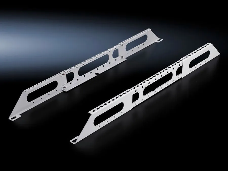 The depth-variable support system may be attached to all 800 – 1200 mm deep network racks with external screw-fastening of the roof plate. The integral system punchings, for screws or captive nuts, support the attachment of most common cable route systems.