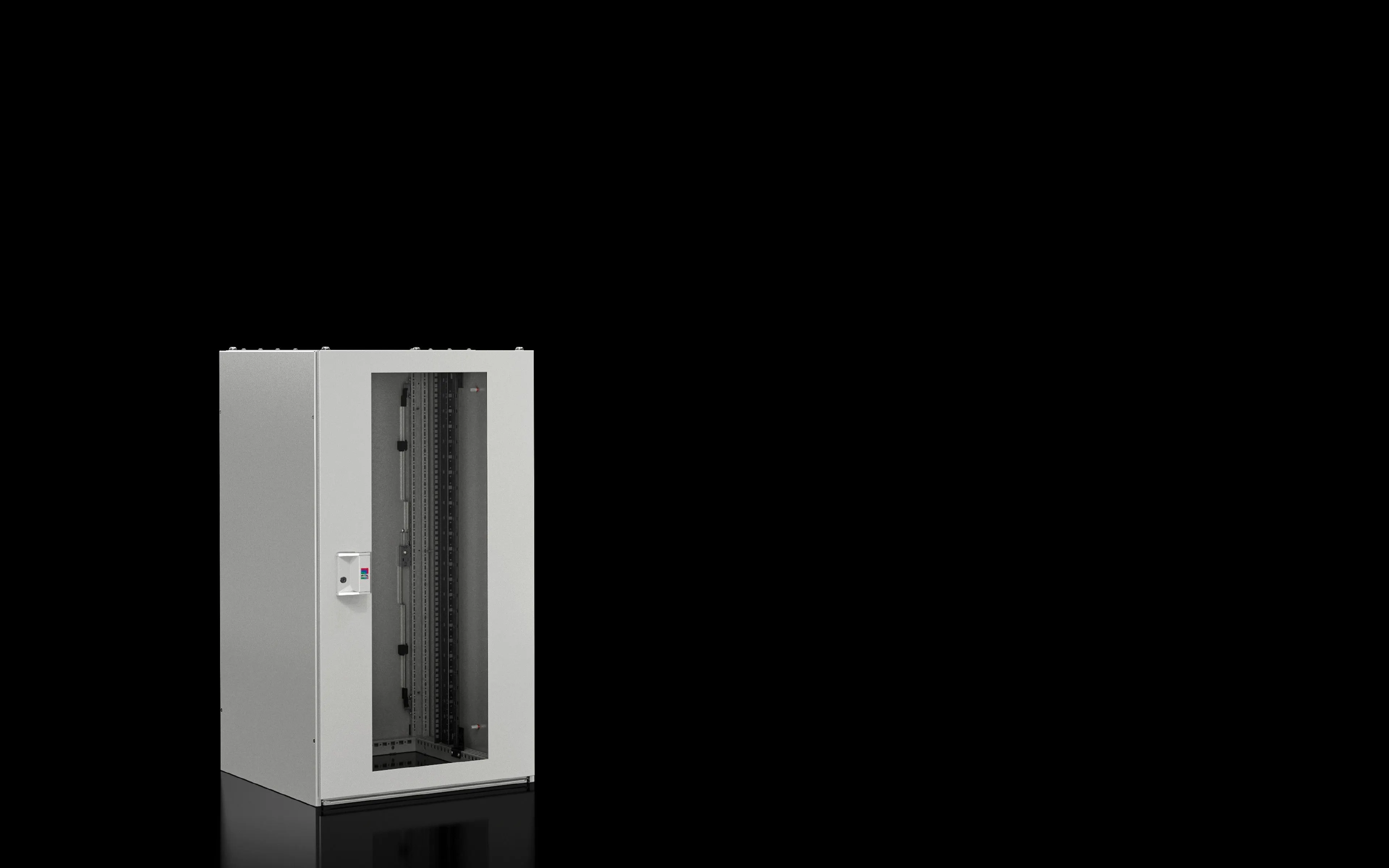 Enclosure with glazed front door and rear door | Side panels, screw fastened | 482.6 mm (19") mounting angles | Roof plate, screw-fastened, with concealed cable entry at the rear, prepared for fan mounting.