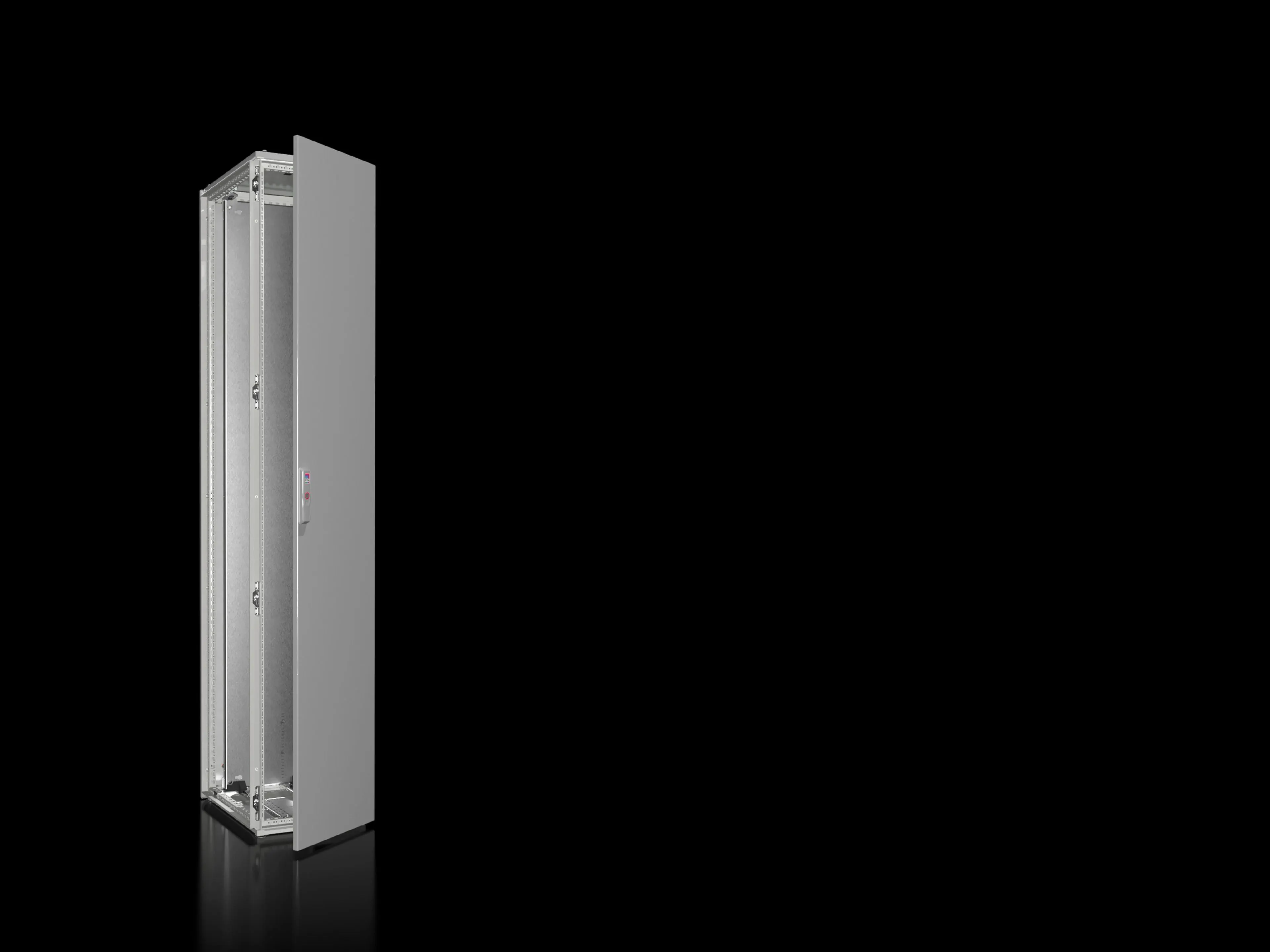 VX 8405.000 includes a mounting plate measuring 299 mm by 1,896 mm and two punched rails (18 x 39 mm) to accommodate standard 19-inch equipment. The door is hinged on the right by default but can be swapped to the left, enabling flexible rack layouts and quick retrofits without structural changes.