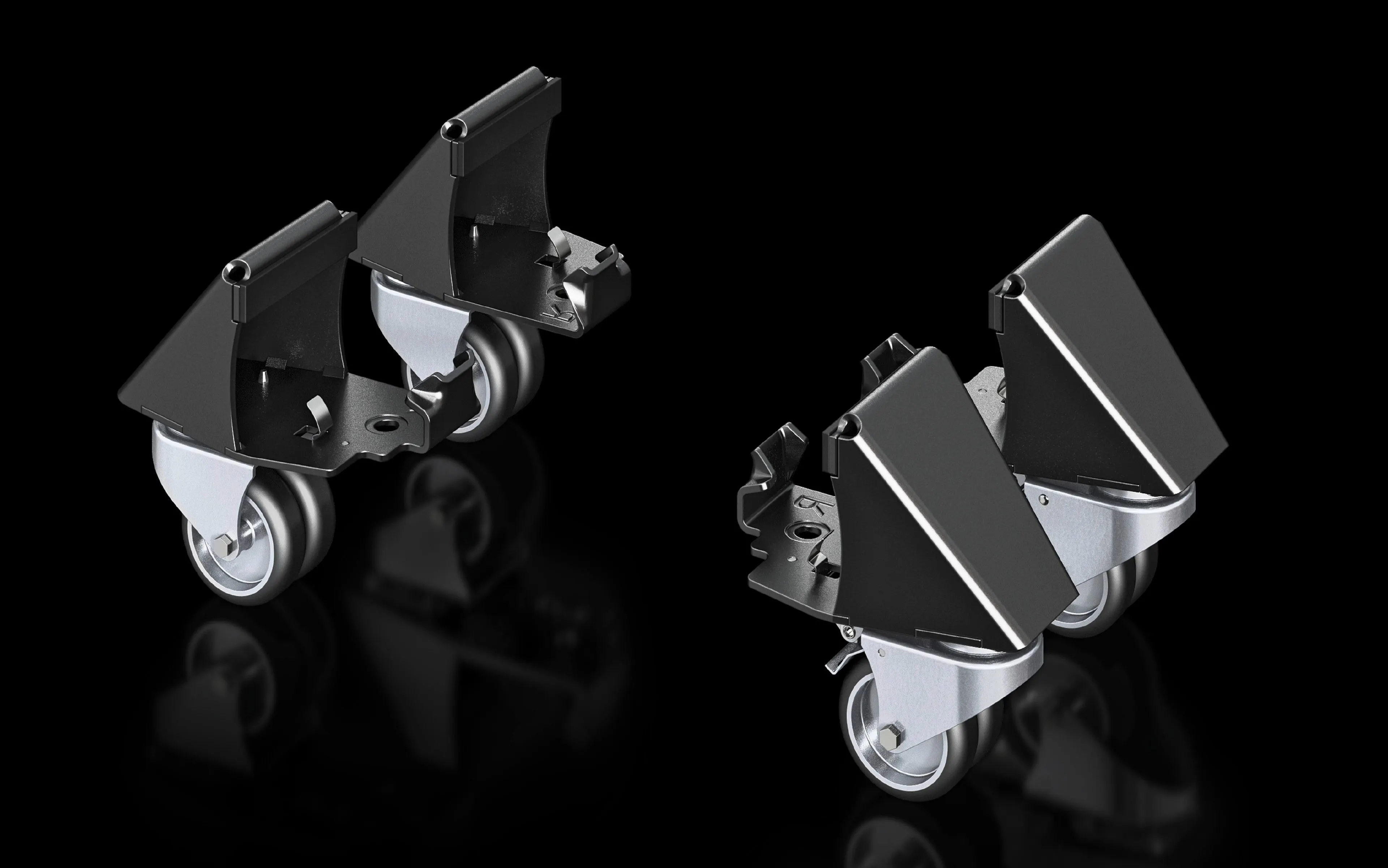 The VX 8660.110 set ships with four twin castors, two with locks and two without, designed to fasten to base plinths at 100 or 200 mm. Begin by aligning the mounting holes with the plinth interface, secure each caster with the supplied fasteners, and test lock functionality. This keeps the enclosure stable during operation and easy relocation when required.