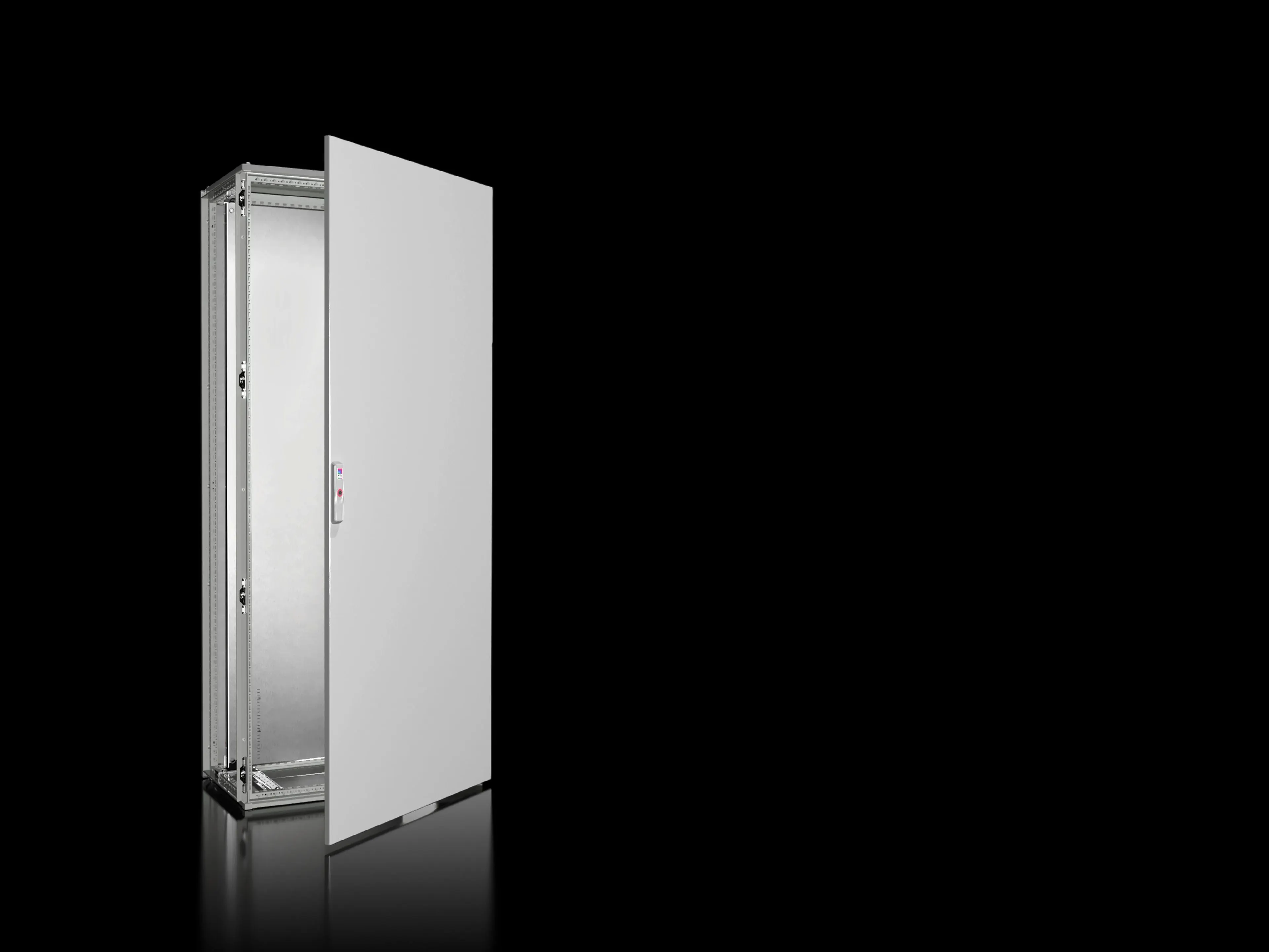 The VX 8884.000 includes two punched rails (18x39 mm), a 699x1696 mm mounting plate, gland plates, and a door that can hinge on the right or be swapped to the left. This design supports straightforward retrofits and alignment with common cabinet hardware, reducing modification work and preserving existing layouts.