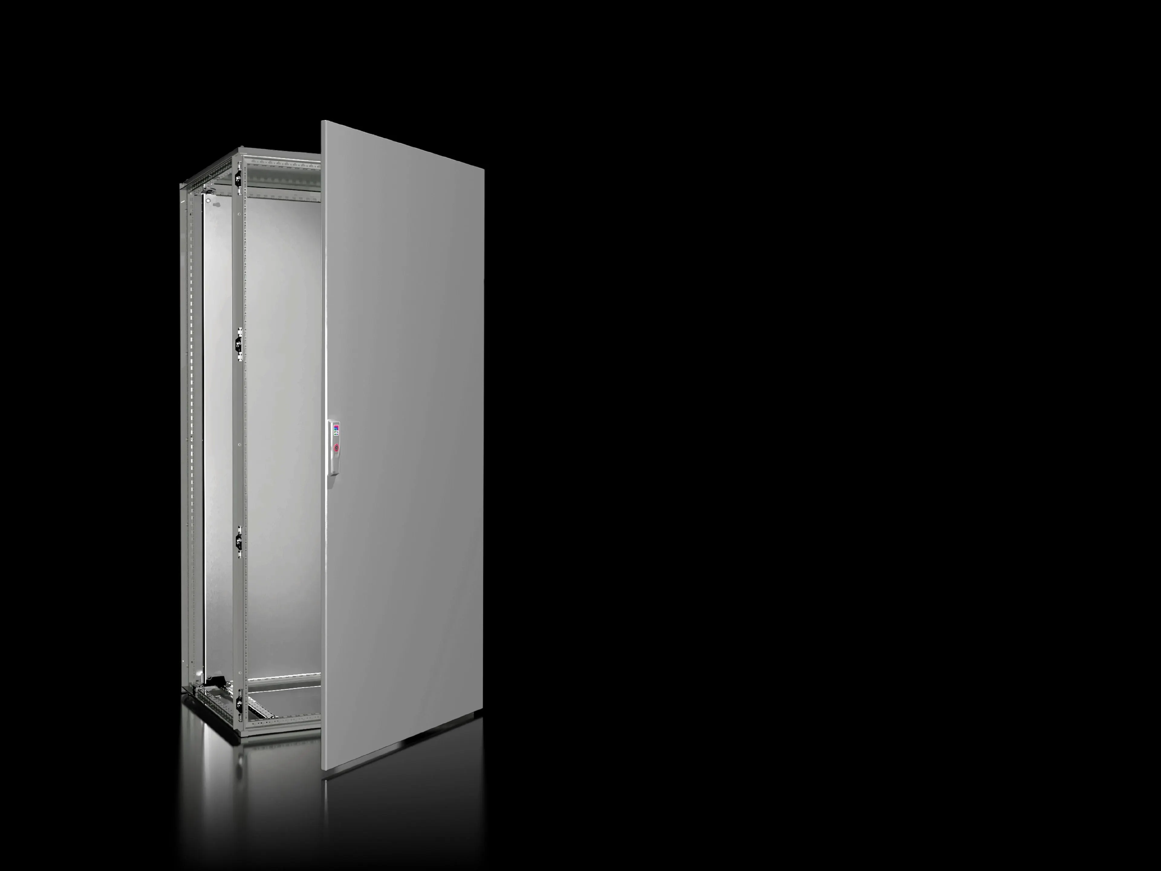 VX 8886.000 ships with two punched rails (18x39 mm), a 699x1696 mm mounting plate, and a single front door hinged on the right that can be swapped to the left. Its 800x1800x600 mm footprint aligns with common panel designs, enabling rapid interior layout and simplified retrofits.