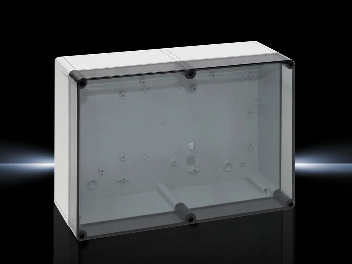9523100 Rittal: PK Polycarbonate enclosure, WHD: 360x254x111 mm, fibreglass-reinforced polycarbonate, without knockouts, with transparent cover