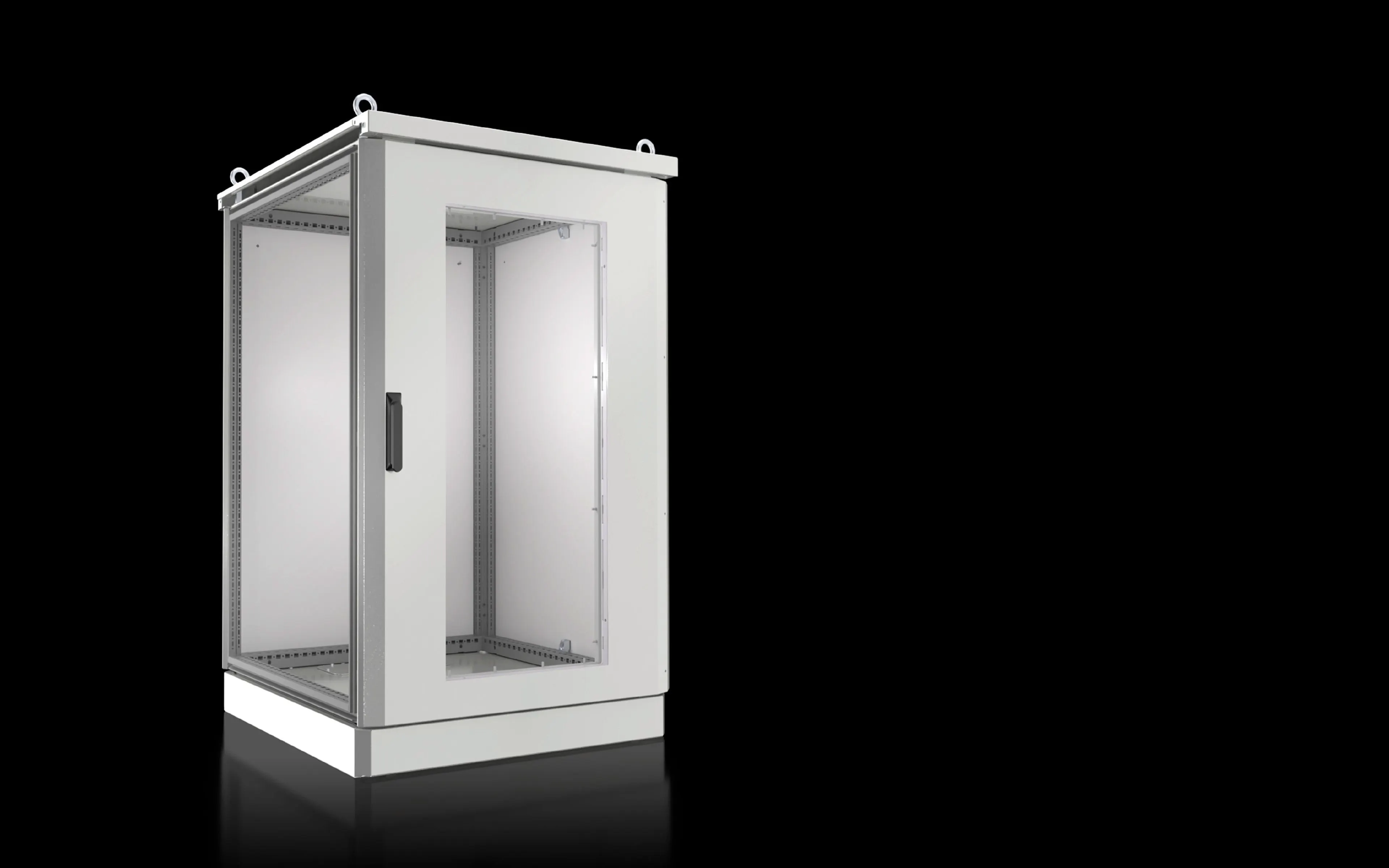 Bayable, twin-walled outdoor enclosure | Enclosure frame with 25 mm system punchings in the roof and base frame plus vertical sections with two mounting levels | Front door with door stay, swing lever handle and profile half-cylinder, lock BJ 20027 | Rear panel | Rain canopy | Base/plinth with screw-fastened gland plates and screw-fastened trim panels front and rear | Door hinged on the right, may be swapped to the left