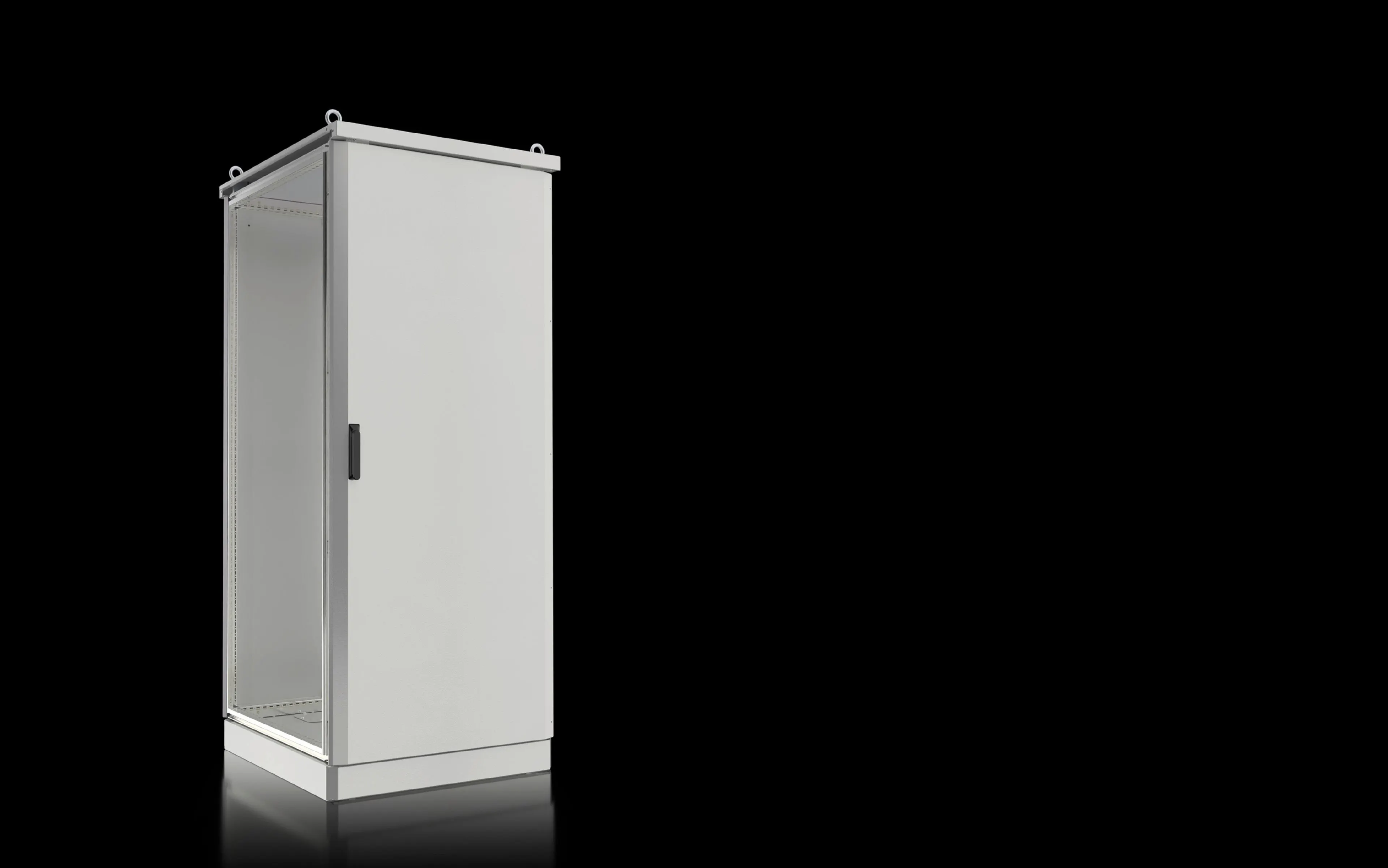 Bayable, twin-walled outdoor enclosure | Enclosure frame with 25 mm system punchings in the roof and base frame plus vertical sections with two mounting levels | Front door with door stay, swing lever handle and profile half-cylinder, lock BJ 20027 | Rear panel | Rain canopy | Base/plinth with screw-fastened gland plates and screw-fastened trim panels front and rear | Door hinged on the right, may be swapped to the left