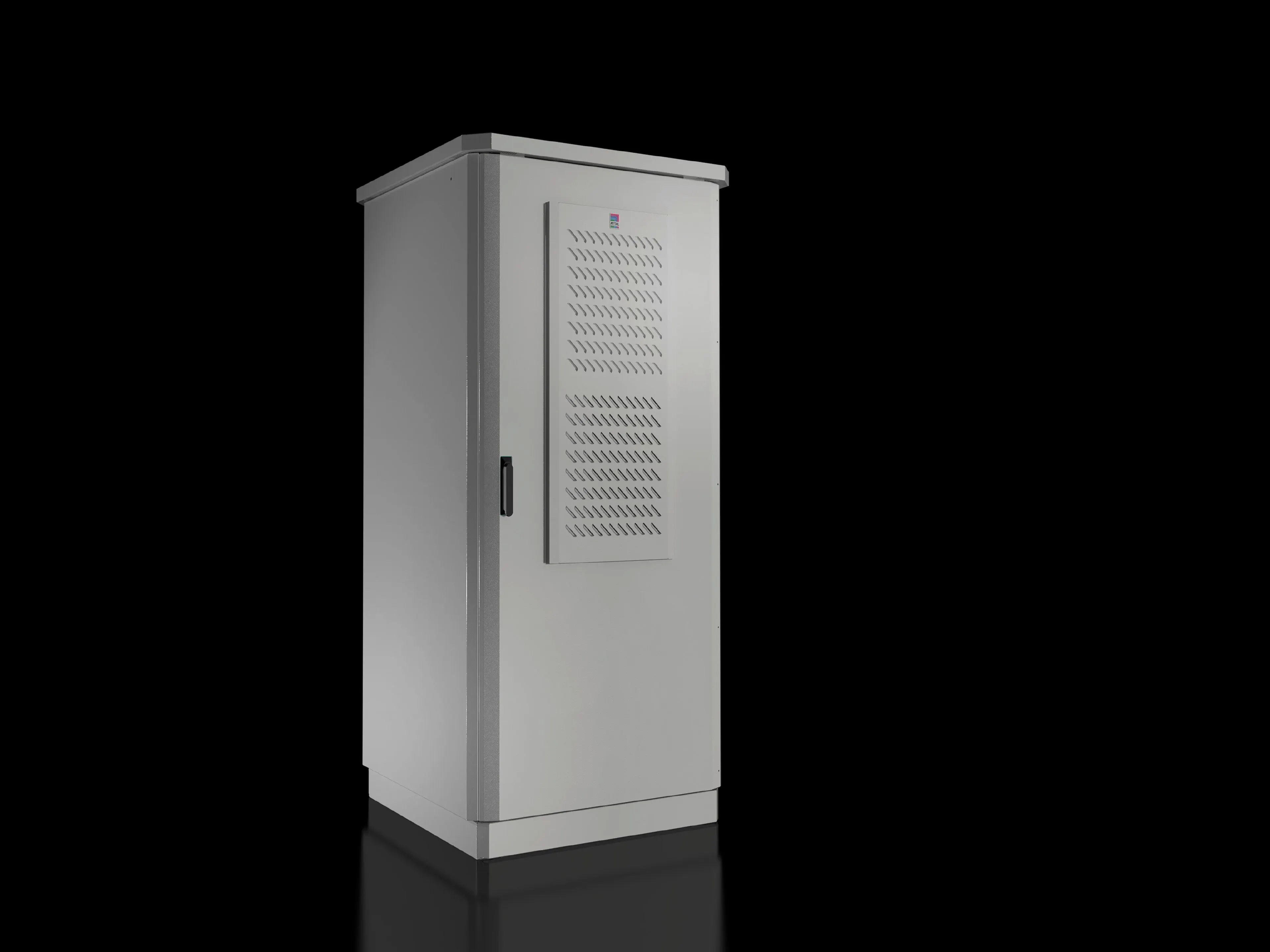 Outdoor enclosure with 100 mm transport plinth and rain canopy with projections on all sides. Side panels, rear panel and door fully double-walled on the outside, the entire TS 8 frame is available for interior installation.