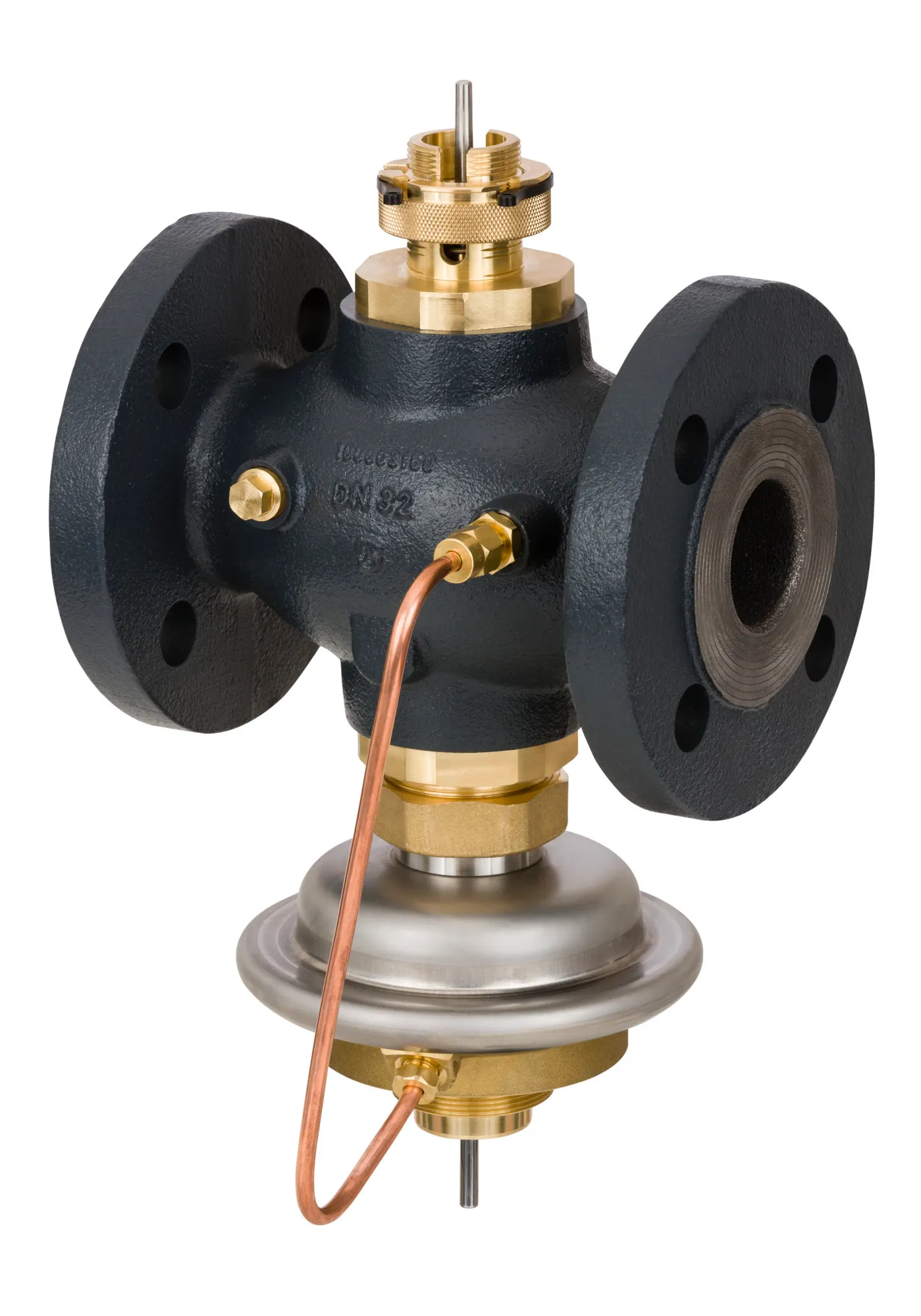Self-acting flow and temperature controller with integrated control valve (AVQMT PN25 flange)