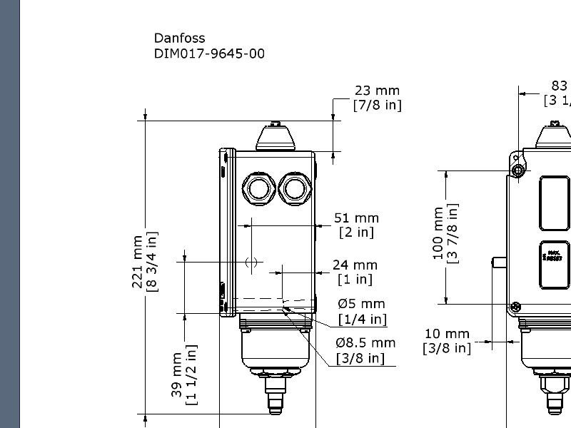 017-503466 Danfoss: Regulation range [bar] Pe: 10.00 - 28.00, Differential [bar]: 1.00, Contact function: SPDT, Reset function: Manual Max, Pressure connection type: Flare, Pressure connection size: 1/4, Pressure Male/Female: Male, Enclosure rating IP: IP54, Max. Working Pressure [bar]: 34.0