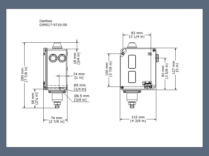017-505266 Danfoss: Regulation range [bar] Pe: 4.00 - 17.00, Differential [bar]: 1.20 - 4.00, Contact function: SPDT, Reset function: Auto, Pressure connection type: M, Pressure connection size: 12 x 1.5, Pressure Male/Female: Male, Enclosure rating IP: IP66, Max. Working Pressure [bar]: 22.0