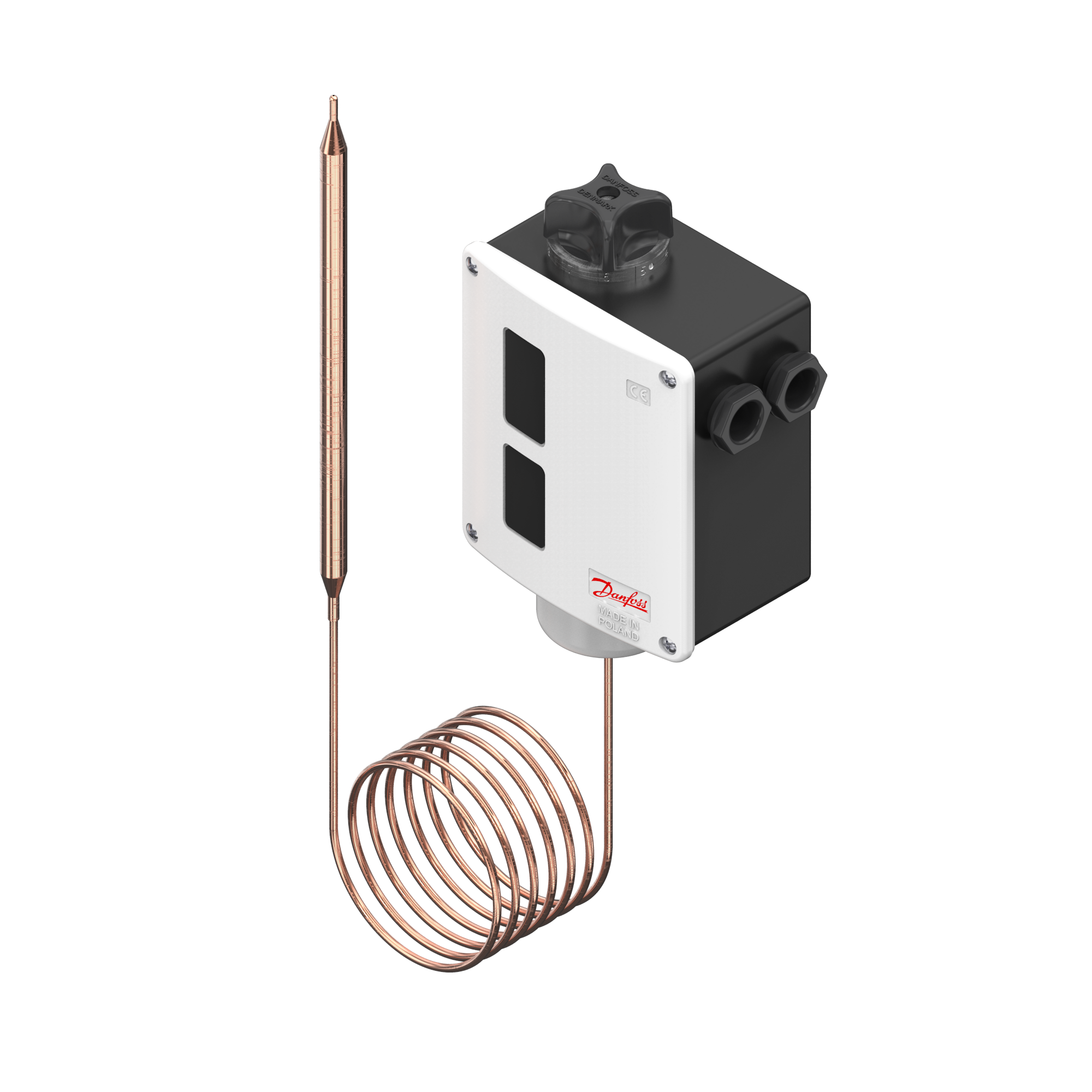 017-528566 Danfoss: Temperature range [°C]: 15 - 34, Reset function: Auto, Contact function: SPDT, Sensor type: Remote bulb, Capillary tube length [mm]: 2000, Enclosure rating IP: IP66