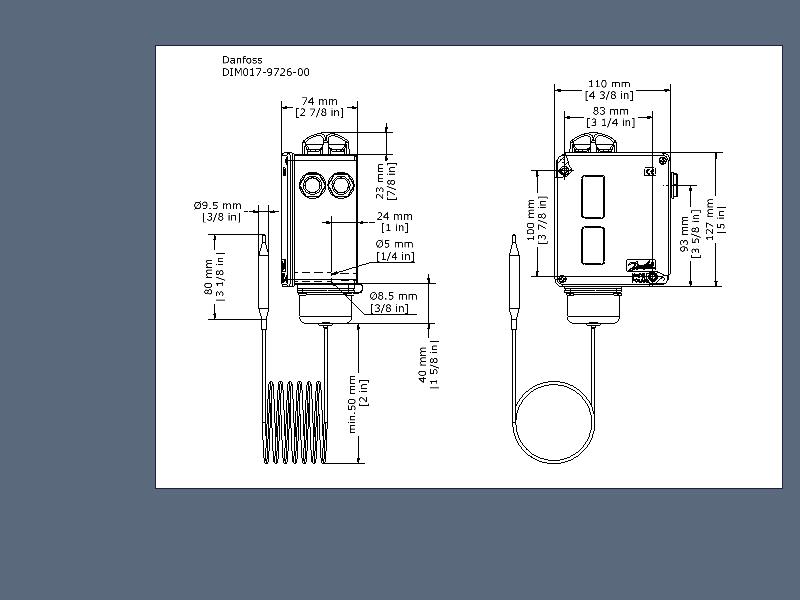 017-618066 Danfoss: Temperature range [°C]: 25 - 90, Reset function: Auto, Contact function: SPDT gold, Sensor type: Remote bulb, Capillary tube length [mm]: 5000, Enclosure rating IP: IP66