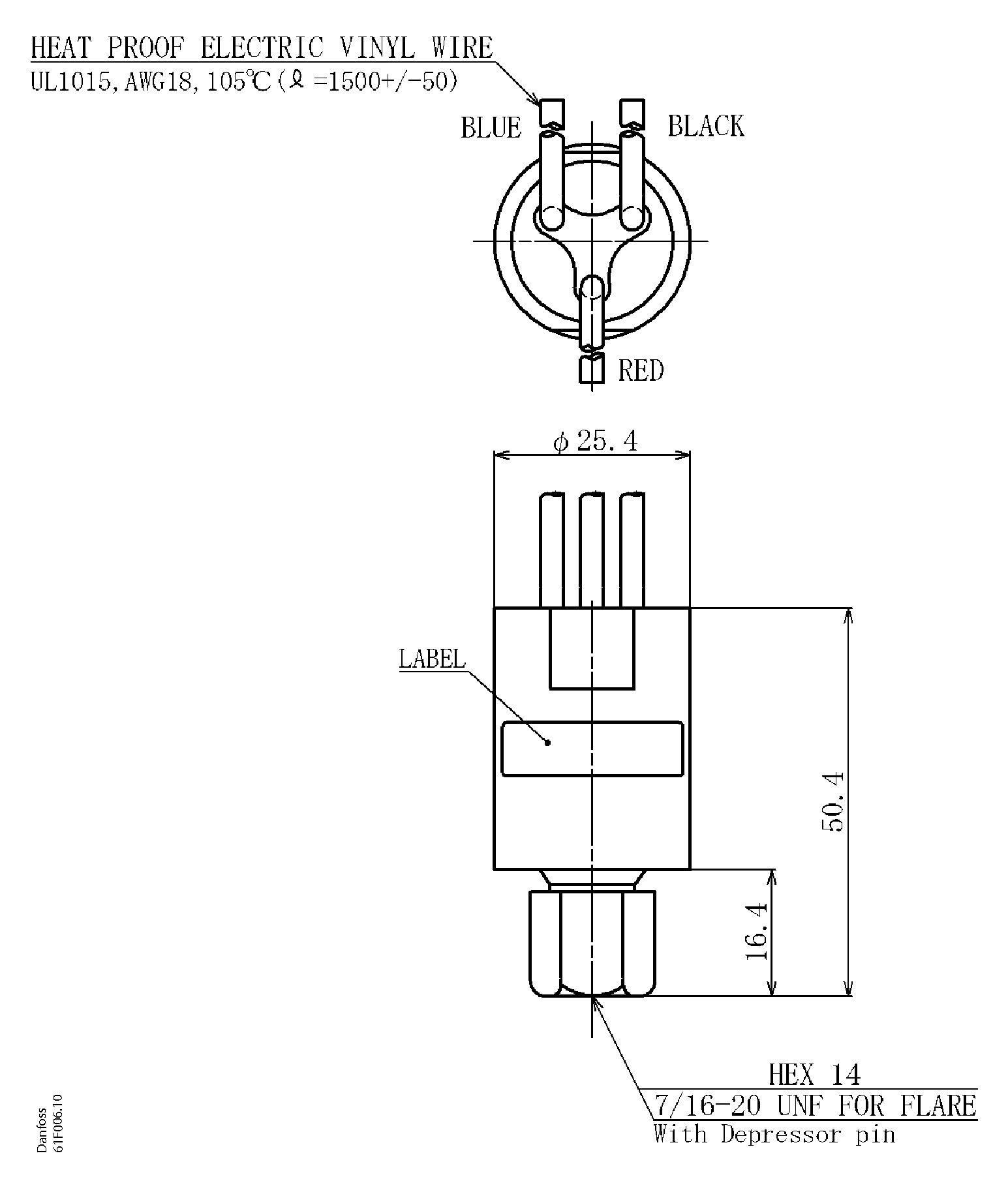 061F9103 Danfoss: Higher activ. pressure [bar]: 28.00, Lower activ. pressure [bar]: 21.00, Reset function: Auto, Contact function: SPDT, Pressure connection type: Flare, Pressure connection size: 1/4 in, Electrical connection: Spade connectors, Enclosure rating IP: IP40