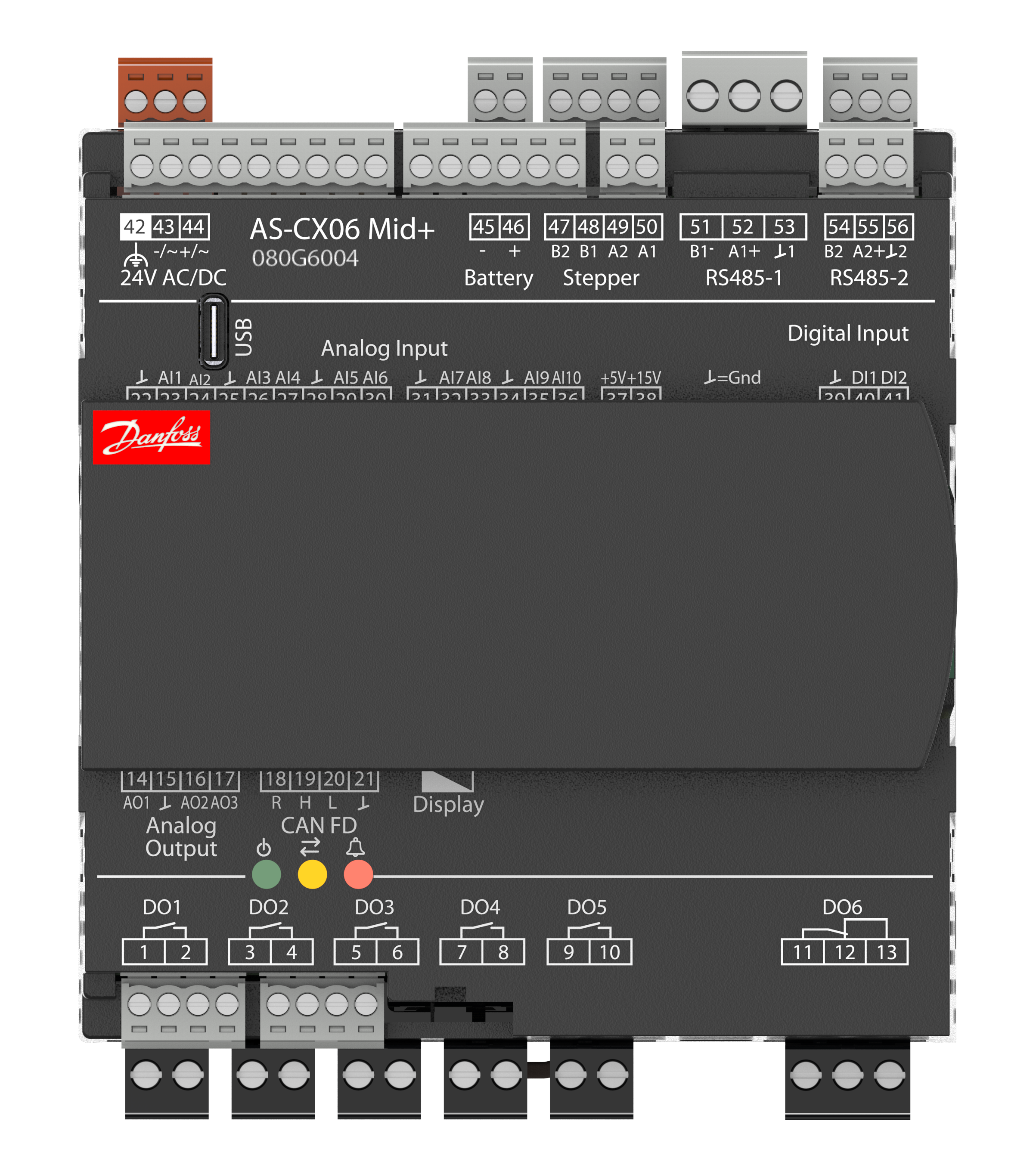 080G6004 Danfoss: Function: Programmable Controller, Supply voltage [V] AC: 24, Communication type: 2xRS485; USB-C; RJ11 (CAN) to User Interface; CAN-FD, Digital inputs (DI) [pc]: 12, Analog inputs (AI) [pc]: 10, Digital outputs (DO) [pc]: 6, Analog outputs (AO) [pc]: 3, Packing format: Single pack