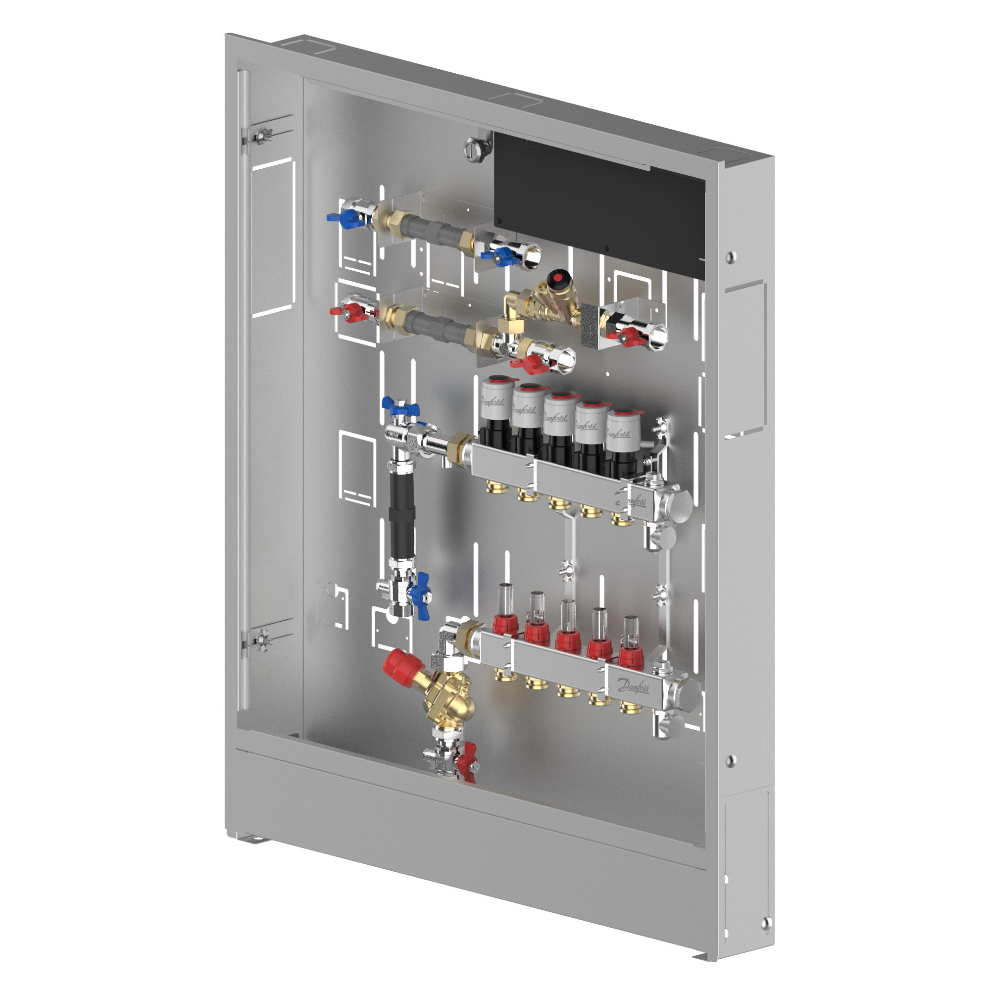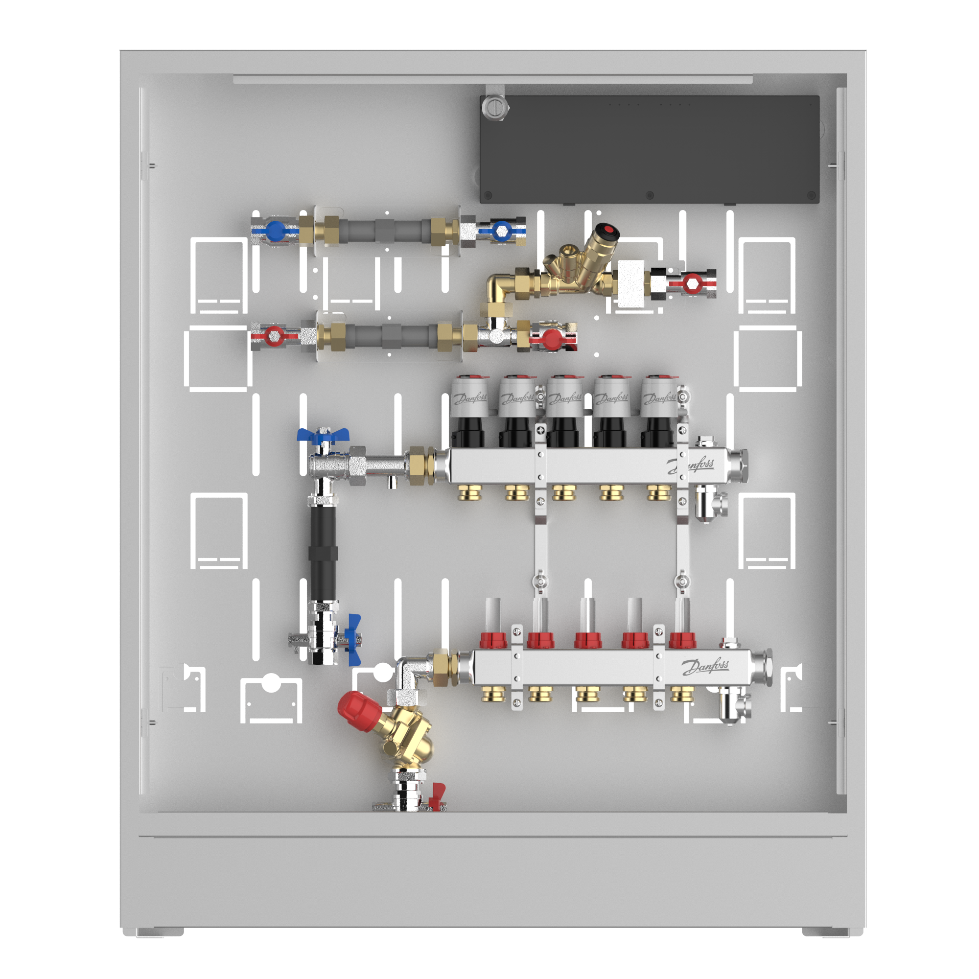 088X4105 Danfoss: Stainless steel manifold 5 loops, DHW line MTCV DHW circulation, AB-PM, in cabinet, ICON Wiring center, left version