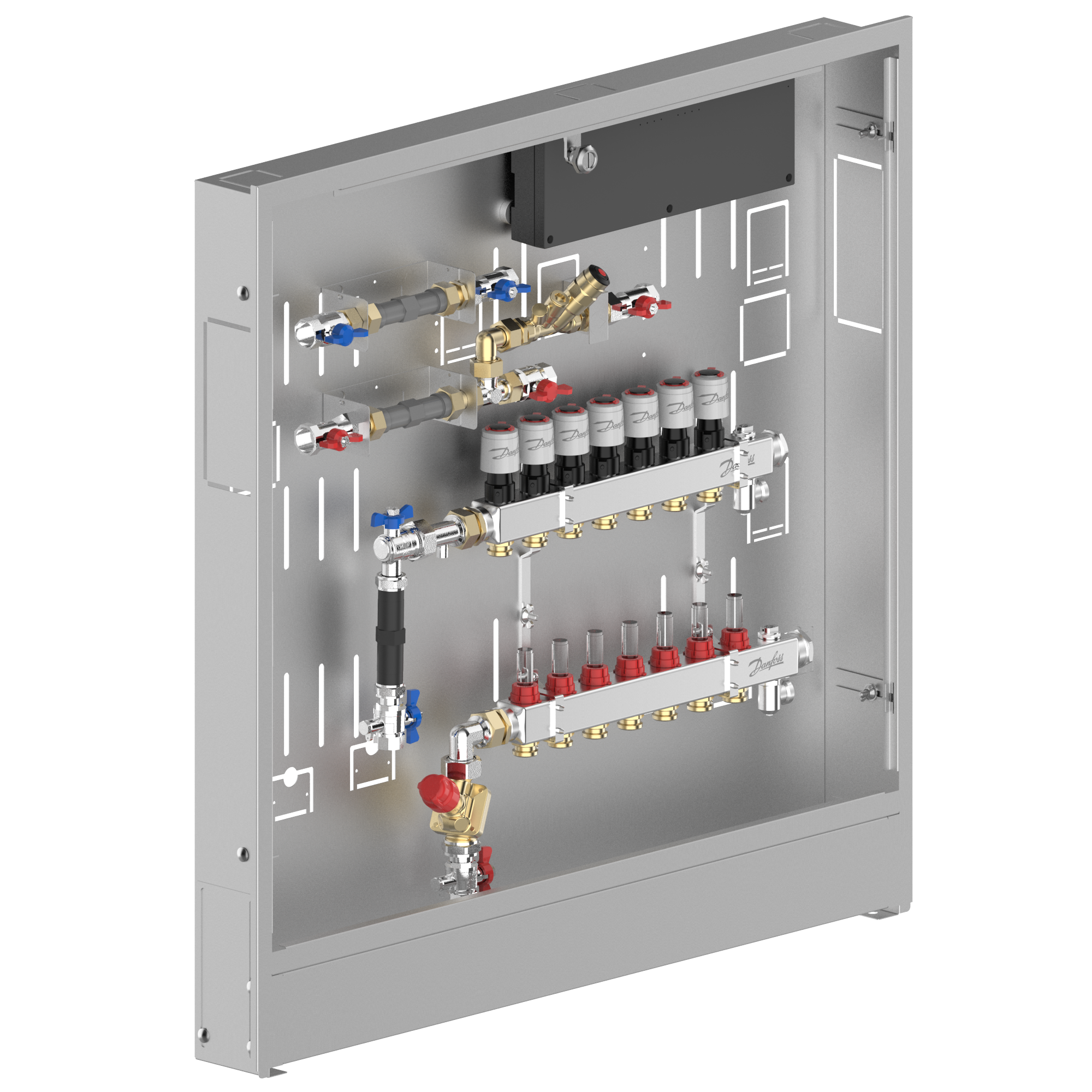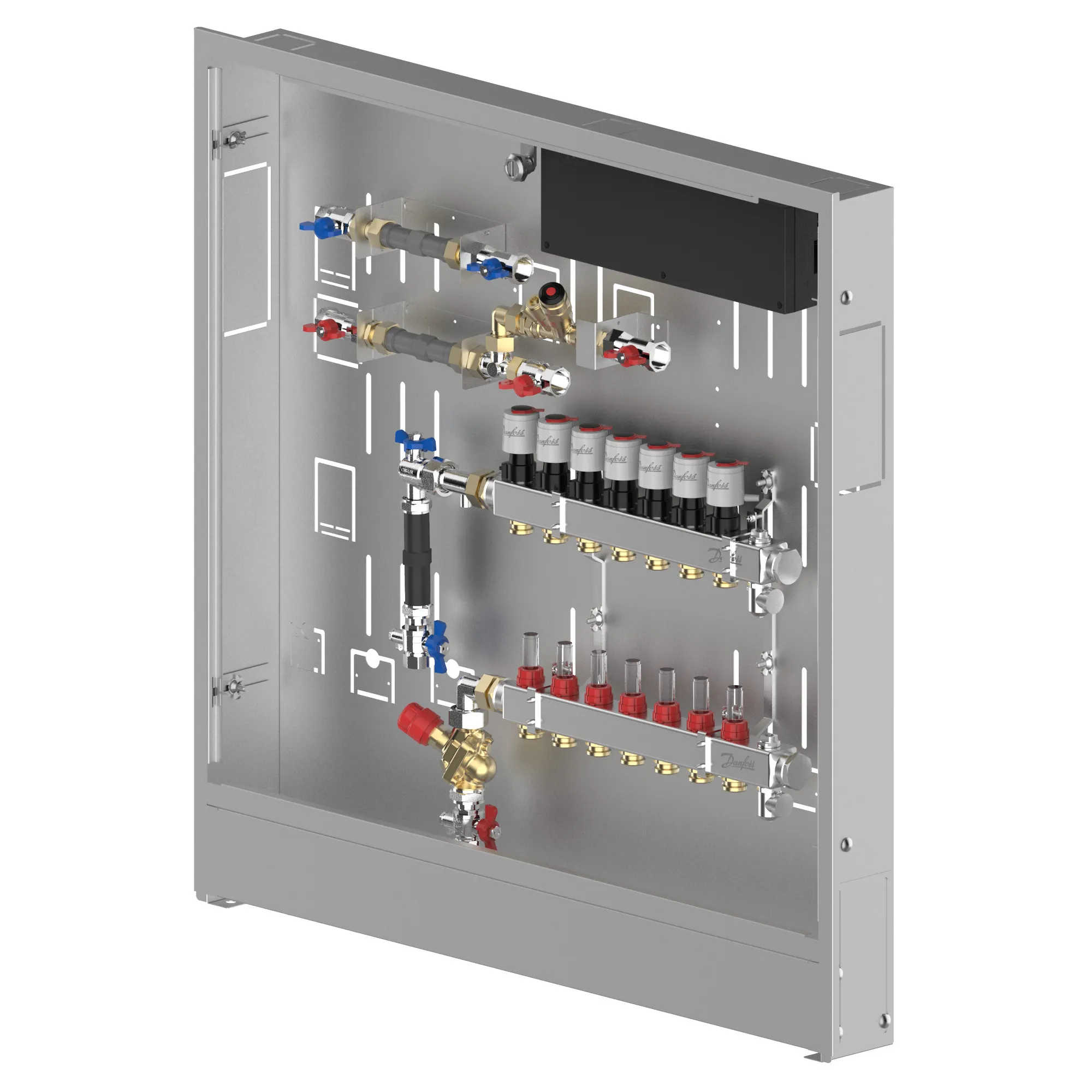 088X4107 Danfoss: Stainless steel manifold 7 loops, DHW line MTCV DHW circulation, AB-PM, in cabinet, ICON Wiring center, left version