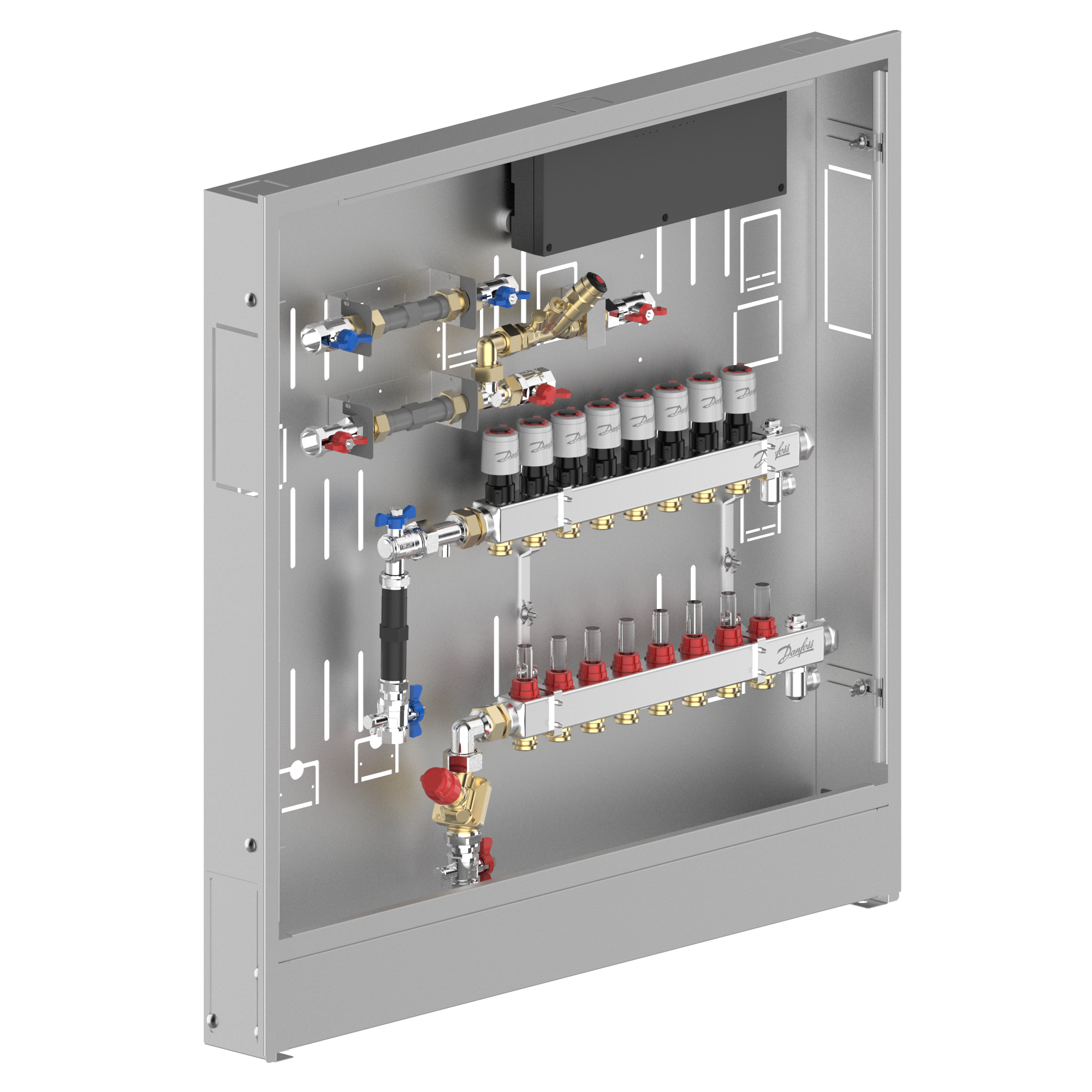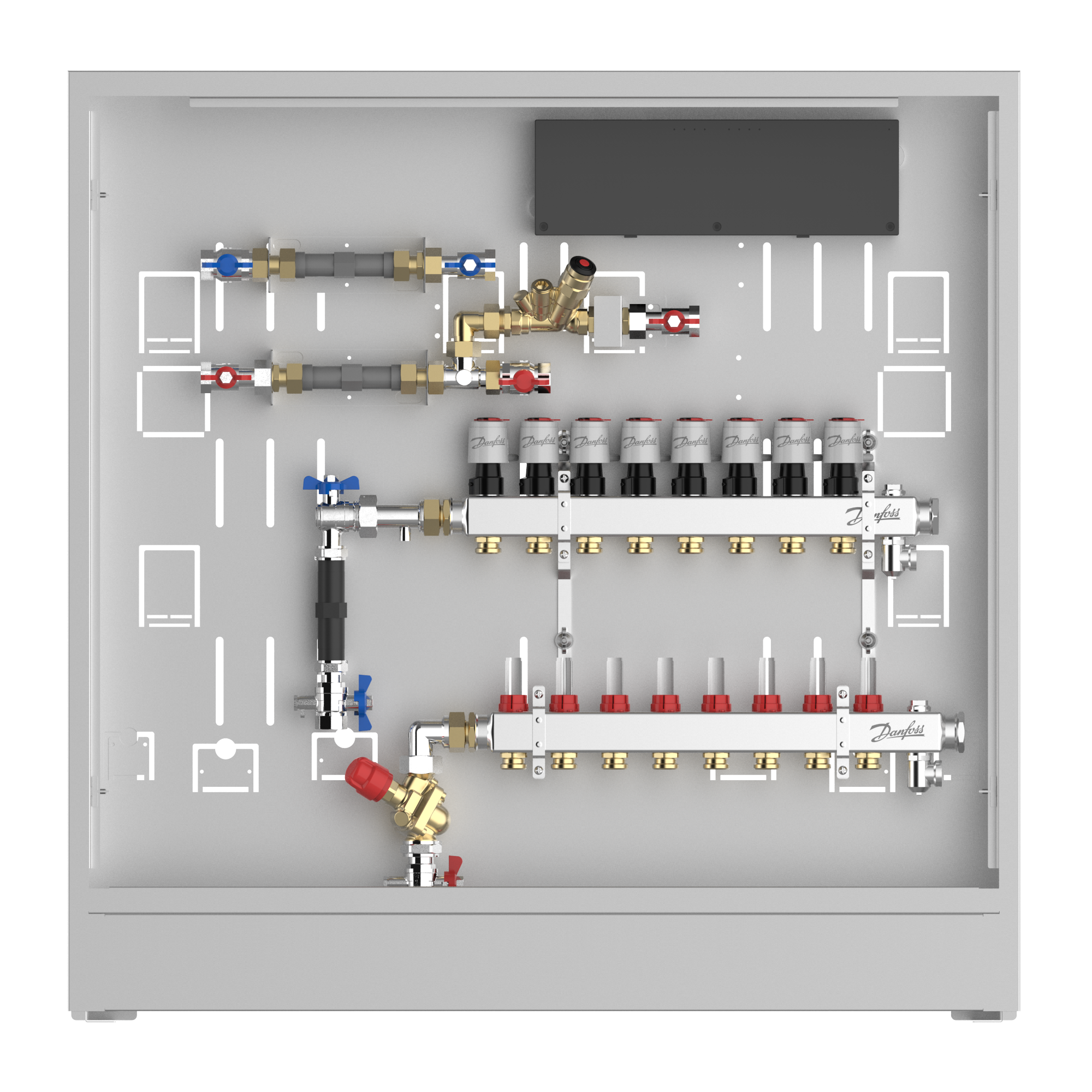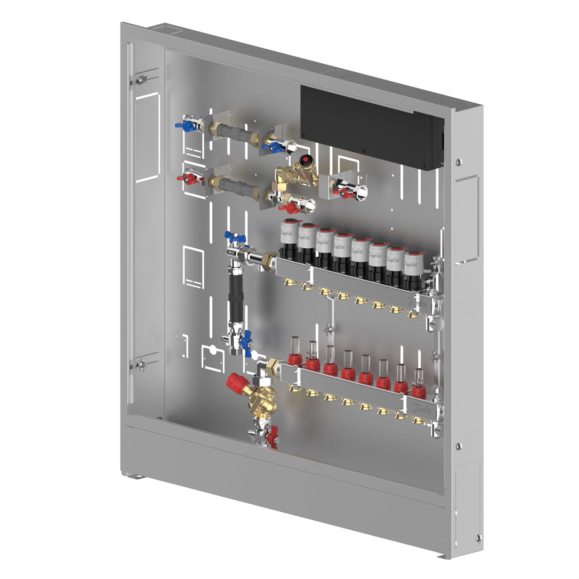 088X4108 Danfoss: Stainless steel manifold 8 loops, DHW line MTCV DHW circulation, AB-PM, in cabinet, ICON Wiring center, left version