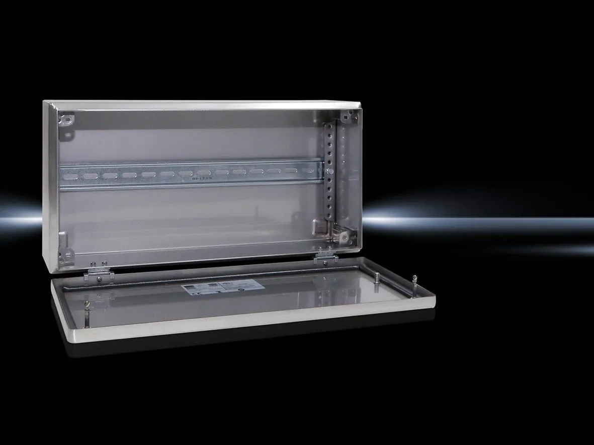 1558010 Rittal: BG Bus enclosure, WHD: 400x200x123 mm, Stainless steel 1.4301, without mounting plate, with cover, with support rail