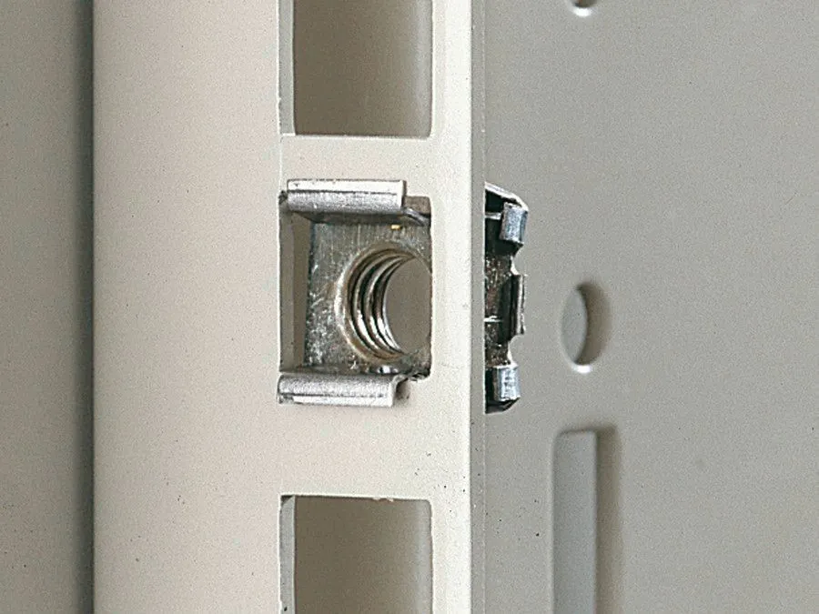 For the attachment of rack-mounted electronic equipment, 482.6 mm (19") installed equipment and blanking plates to mounting angles, 482.6 mm (19"). For use with metal thickness from 0.8 – 2.5 mm. Optionally with or without contact of the installed equipment to the 482.6 mm (19") section/enclosure.