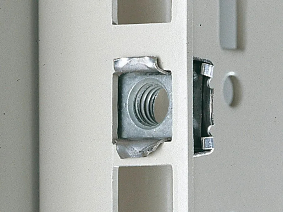 For the attachment of rack-mounted electronic equipment, 482.6 mm (19") installed equipment and blanking plates to mounting angles, 482.6 mm (19"). For use with metal thickness from 0.8 – 2.5 mm. Optionally with or without contact of the installed equipment to the 482.6 mm (19") section/enclosure.