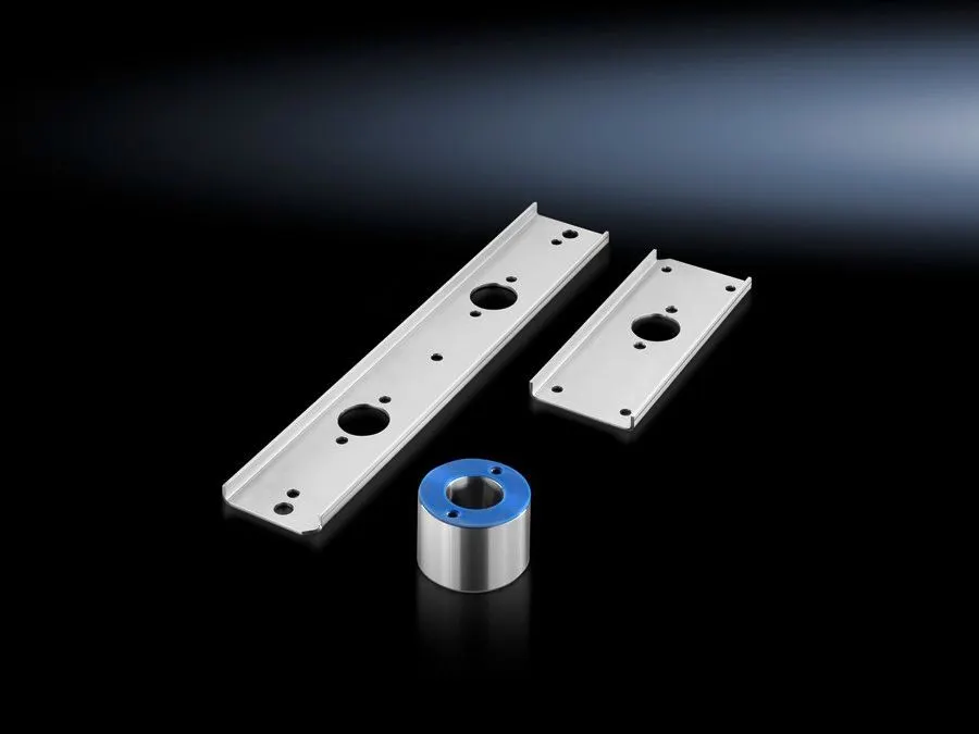 2 reinforcement plates for enclosure, top | 4 reinforcement plates for enclosure, bottom (2 for the roof, 2 for the attachment of levelling feet or supporting structure) | 2 spacer supports with drilled hole Ø 40 mm for cable entry, height 50/45.8 mm | Assembly parts and seals