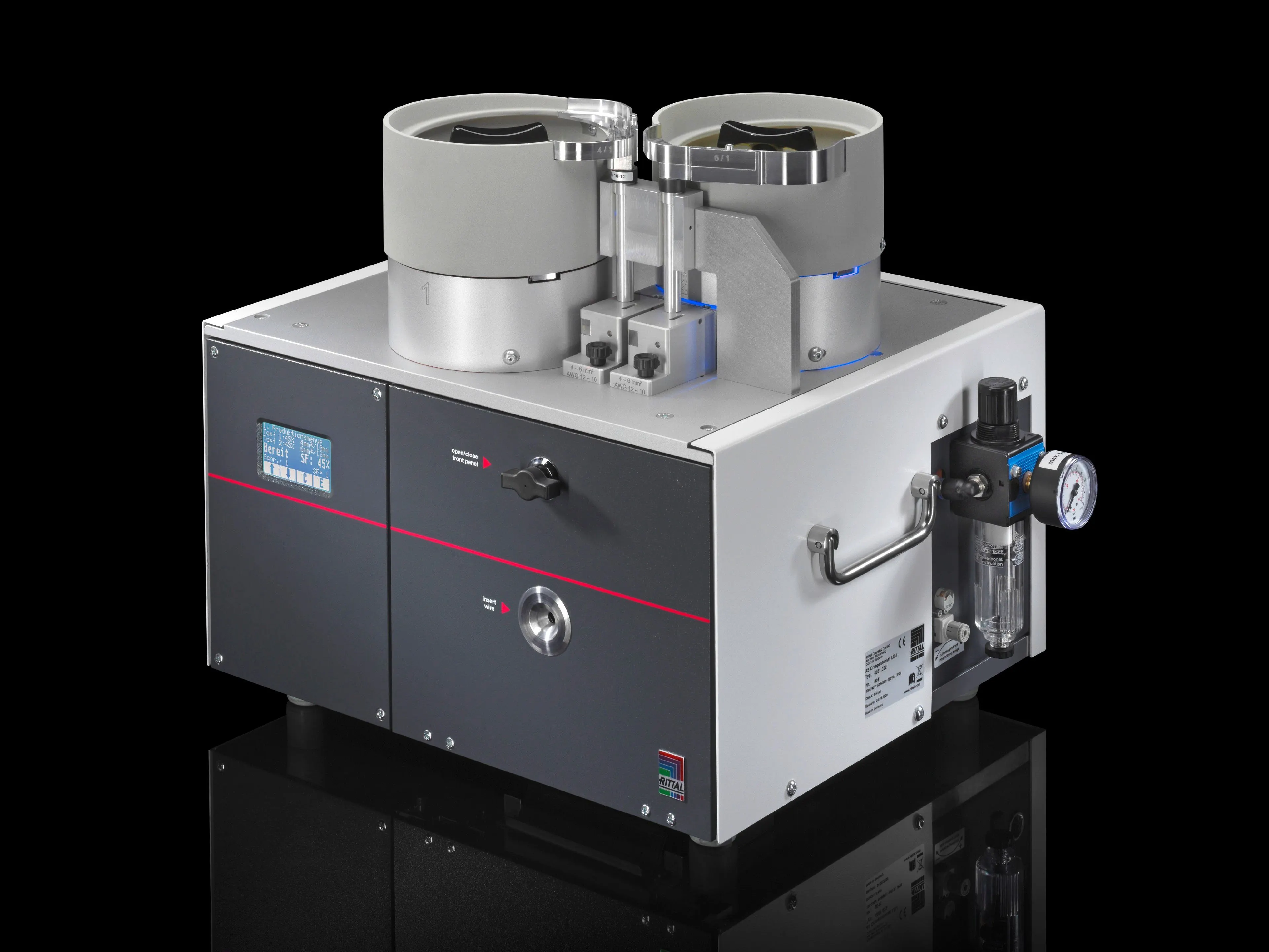 4051022 Rittal: The electro-pneumatic insulation stripping and crimping centre with double magazine is used for machining reels of loose, insulated wire end ferrules in the range from 4 to 6 mm² (AWG 12 – 10) and crimping lengths from 10 to 12 mm. The LD-I crimping machine has an interface to communicate with the Rittal Wire Terminal fully automated wire processing machine and supports complete functional integration.