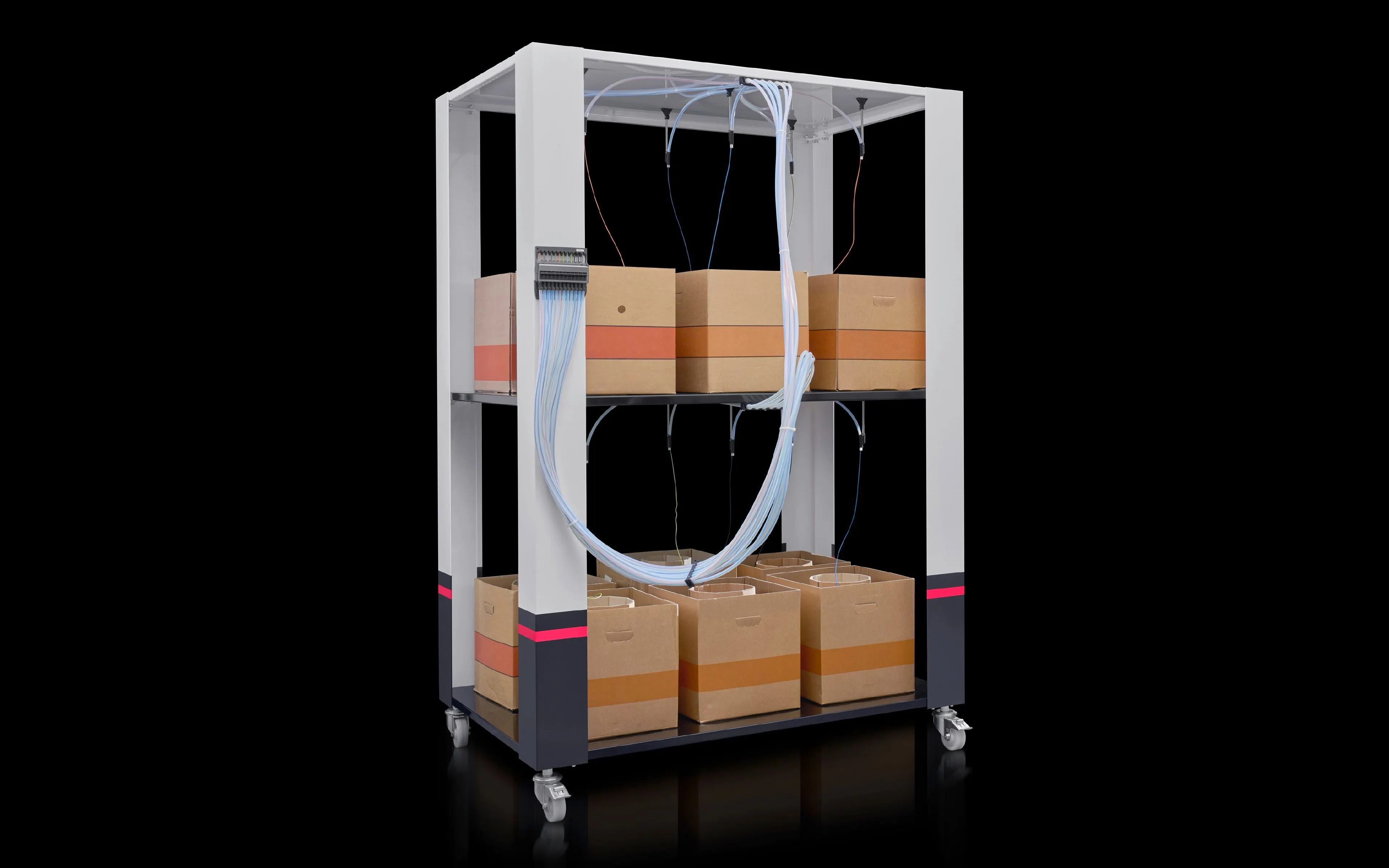 Space-saving storage of six wire containers on two levels