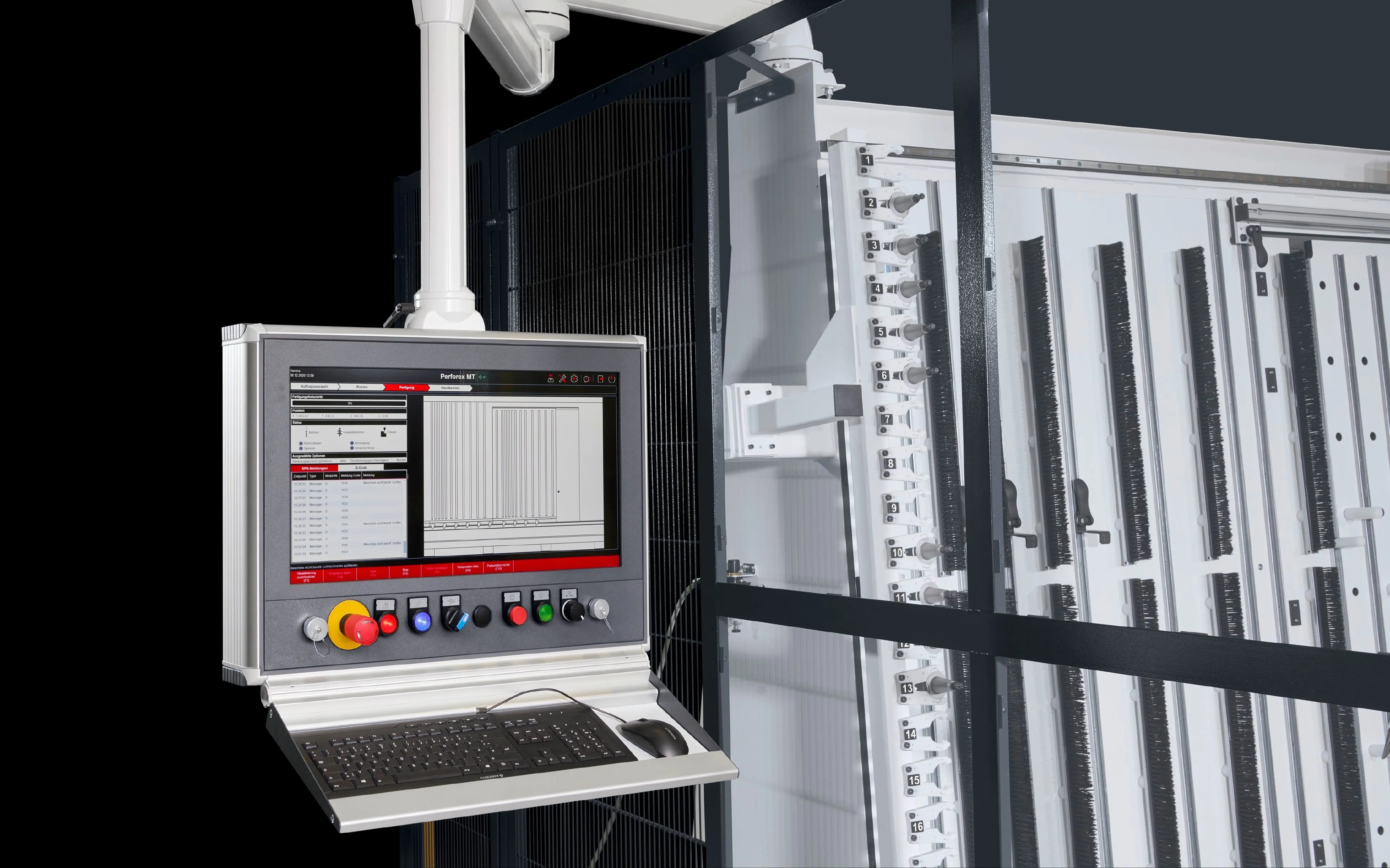 Support arm system for flexible, ergonomic operator positioning on the Perforex milling terminals MT.